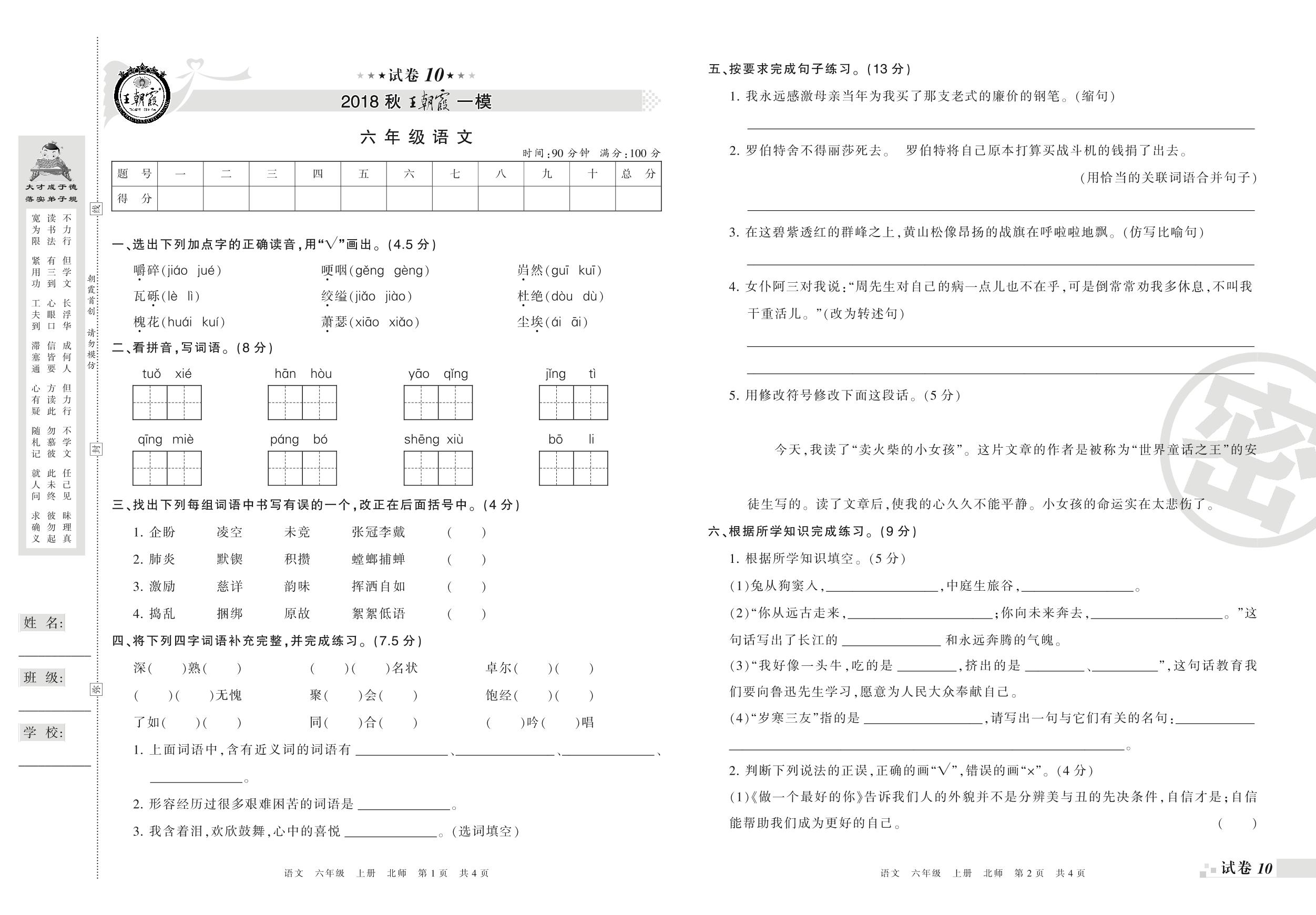 王朝霞期末模拟卷六年级上册语文(北师版)【10】