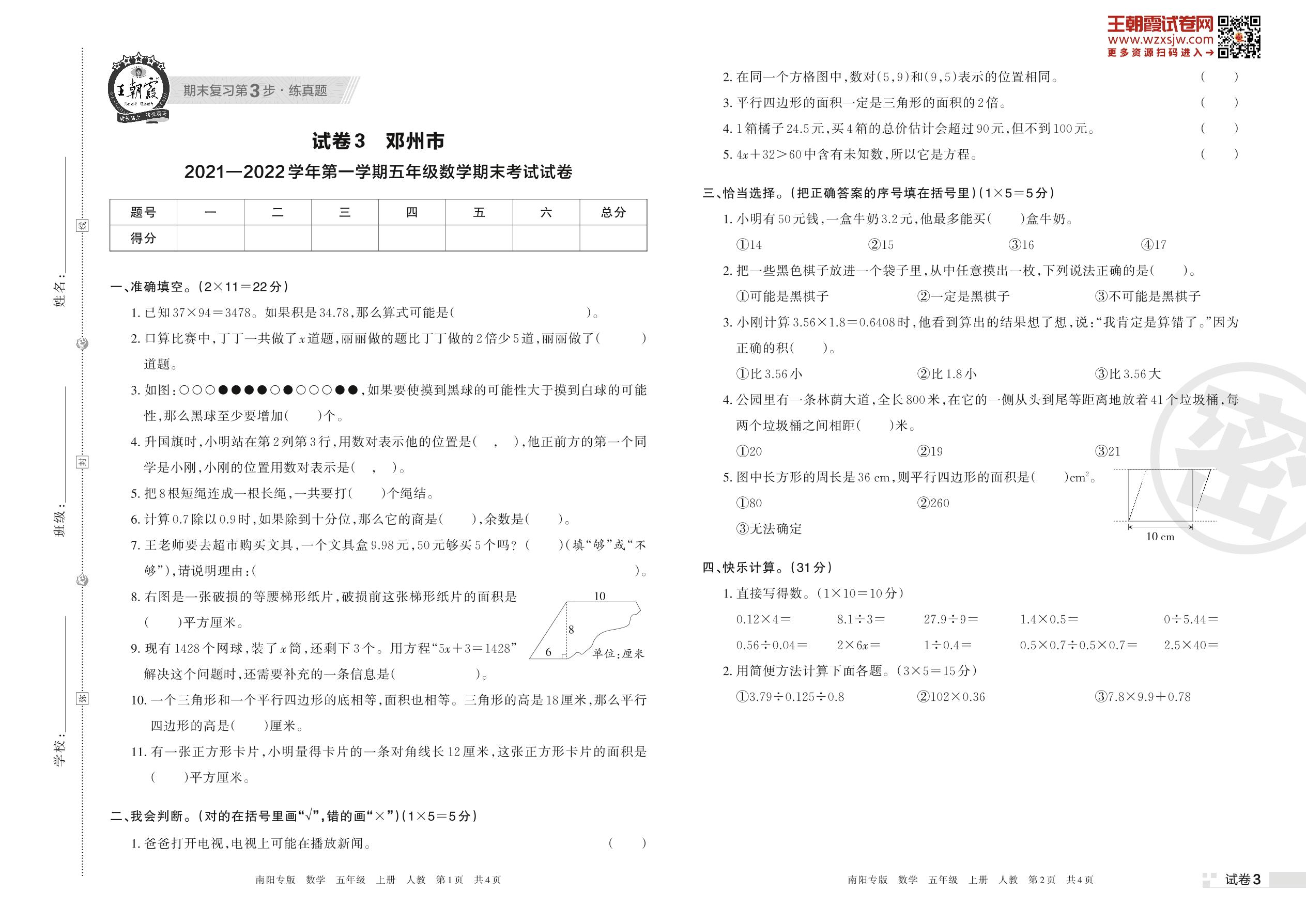 邓州市2021—2022学年第一学期五年级数学期末考试试卷(人教版)【3】
