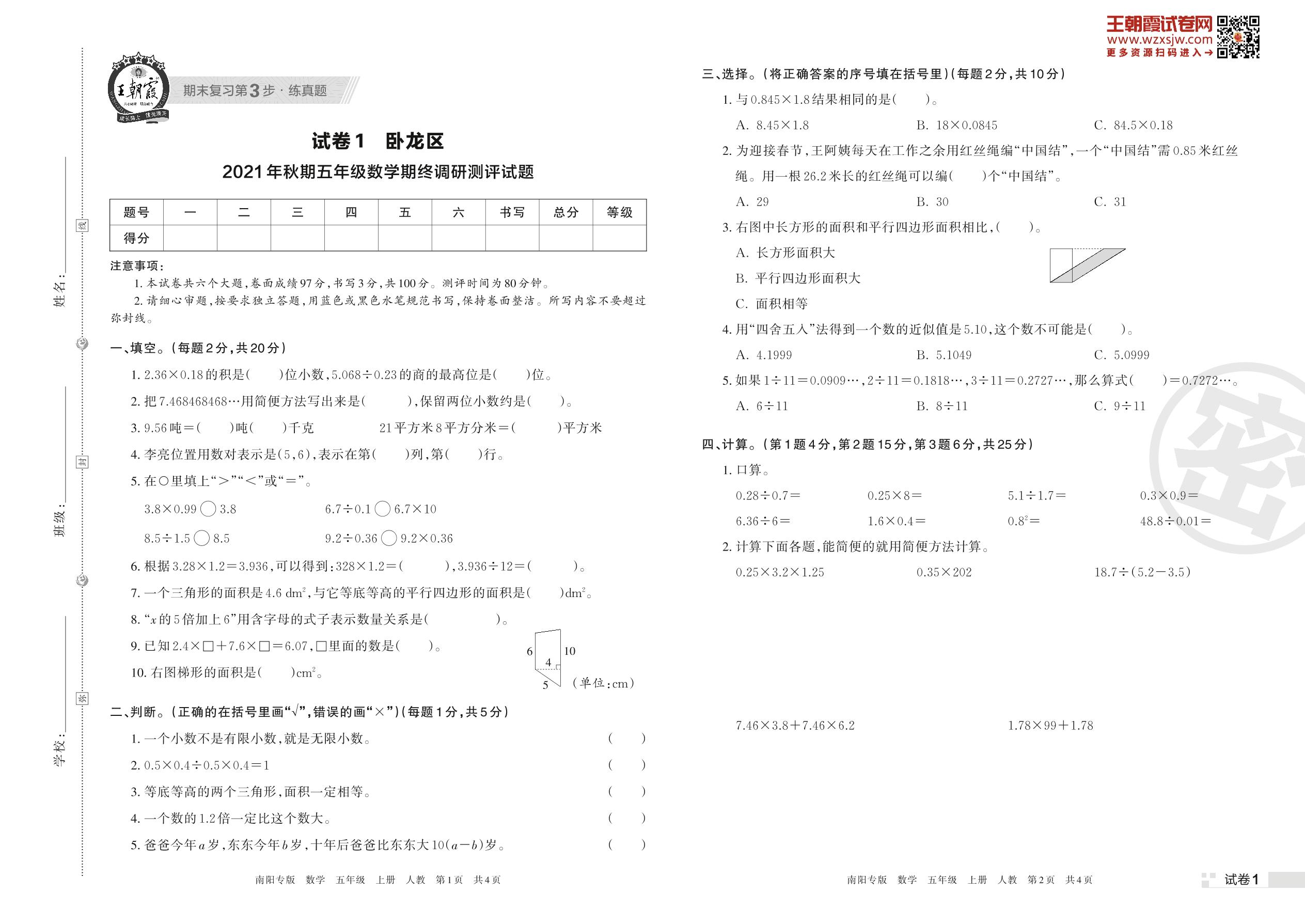 卧龙区2021年秋期五年级数学期终调研测评试题(人教版)【1】