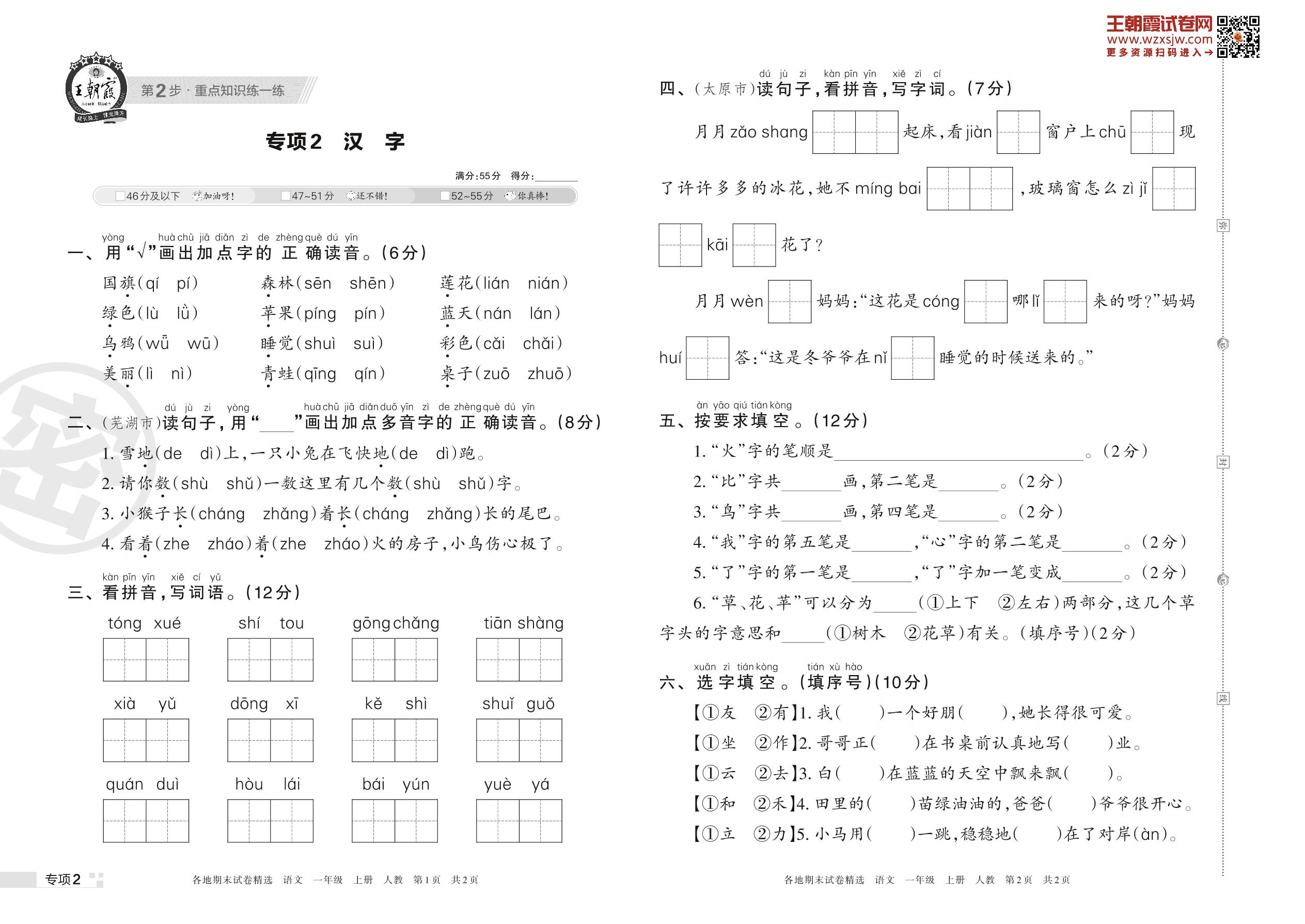 王朝霞期末专项卷——汉字一年级上册语文(人教版)【2】