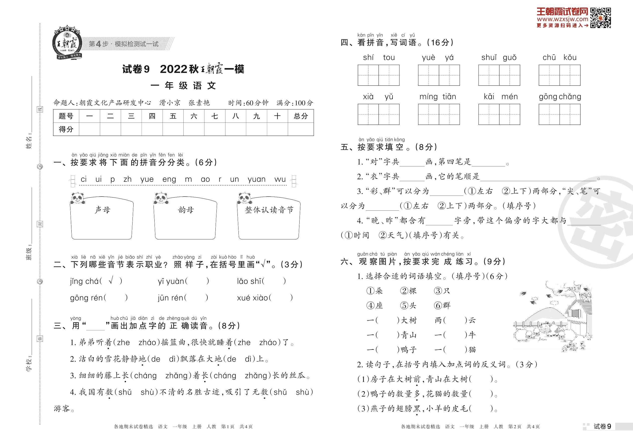 王朝霞期末模拟卷一年级上册语文(人教版)_R221122093709598【9】