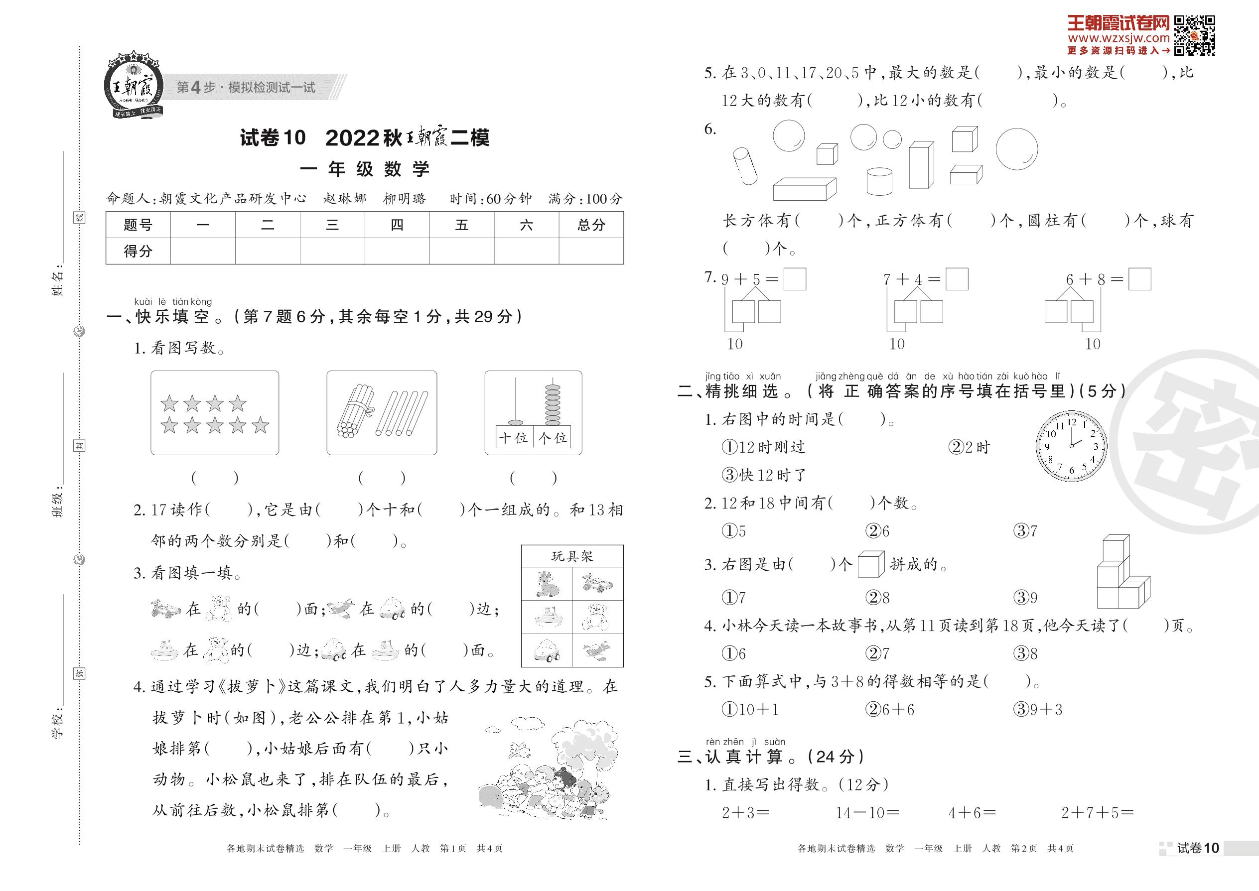王朝霞期末模拟卷一年级上册数学(人教版)_R221122094921707【10】