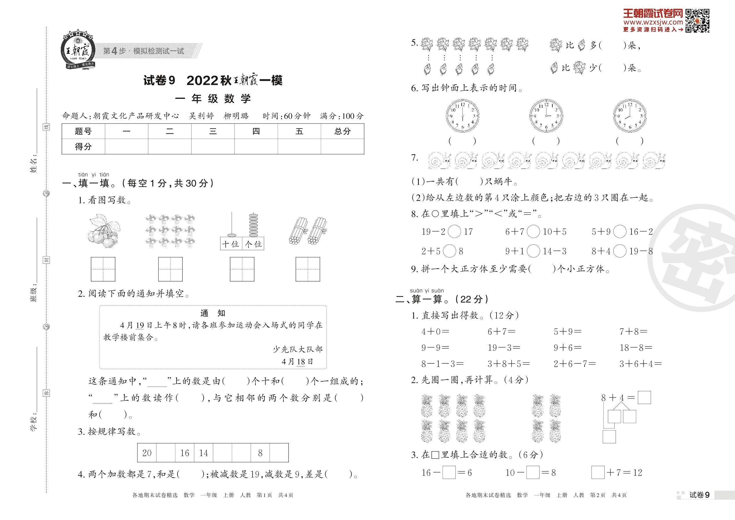 王朝霞期末模拟卷一年级上册数学(人教版)_R221122094921477【9】