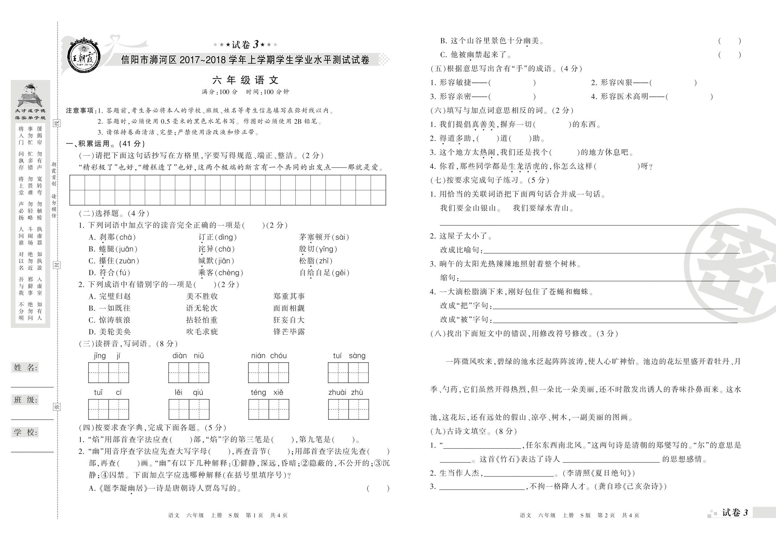 2017-2018学年第一学期信阳市浉河区六年级语文试卷(S版)【3】