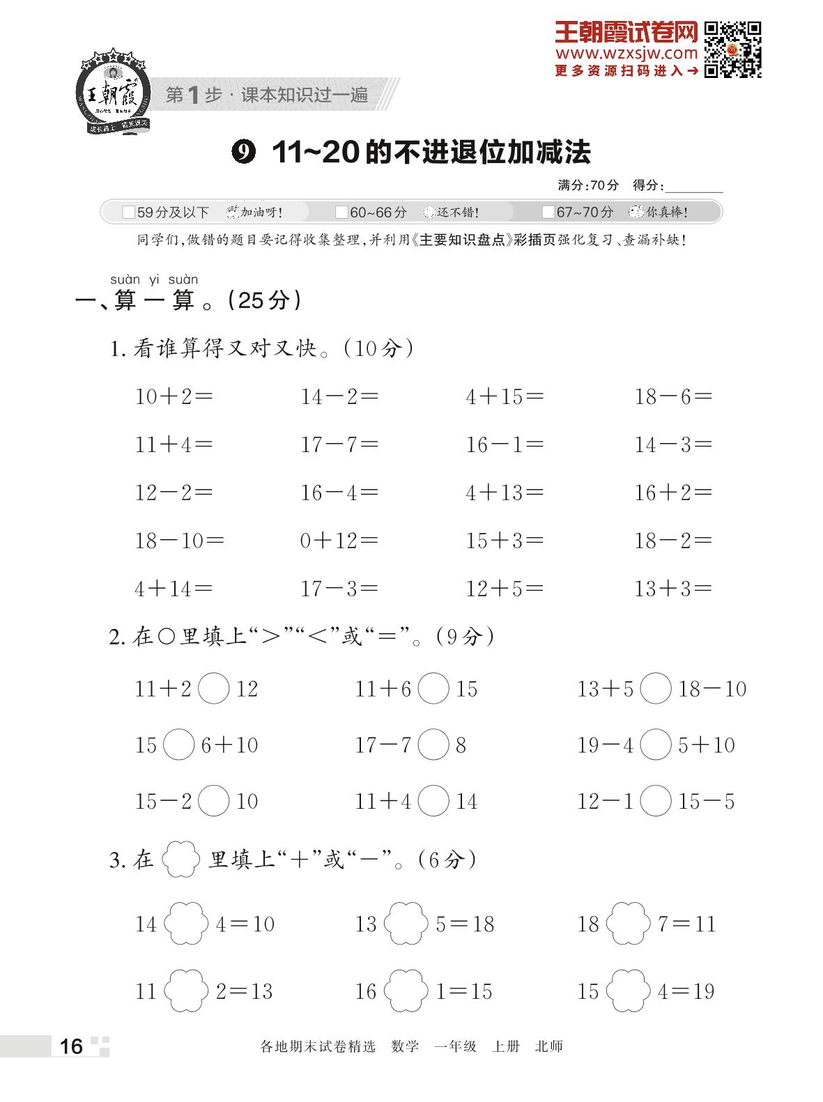 王朝霞期末过课本——9 11~20的不进退位加减法一年级上册数学(北师版)