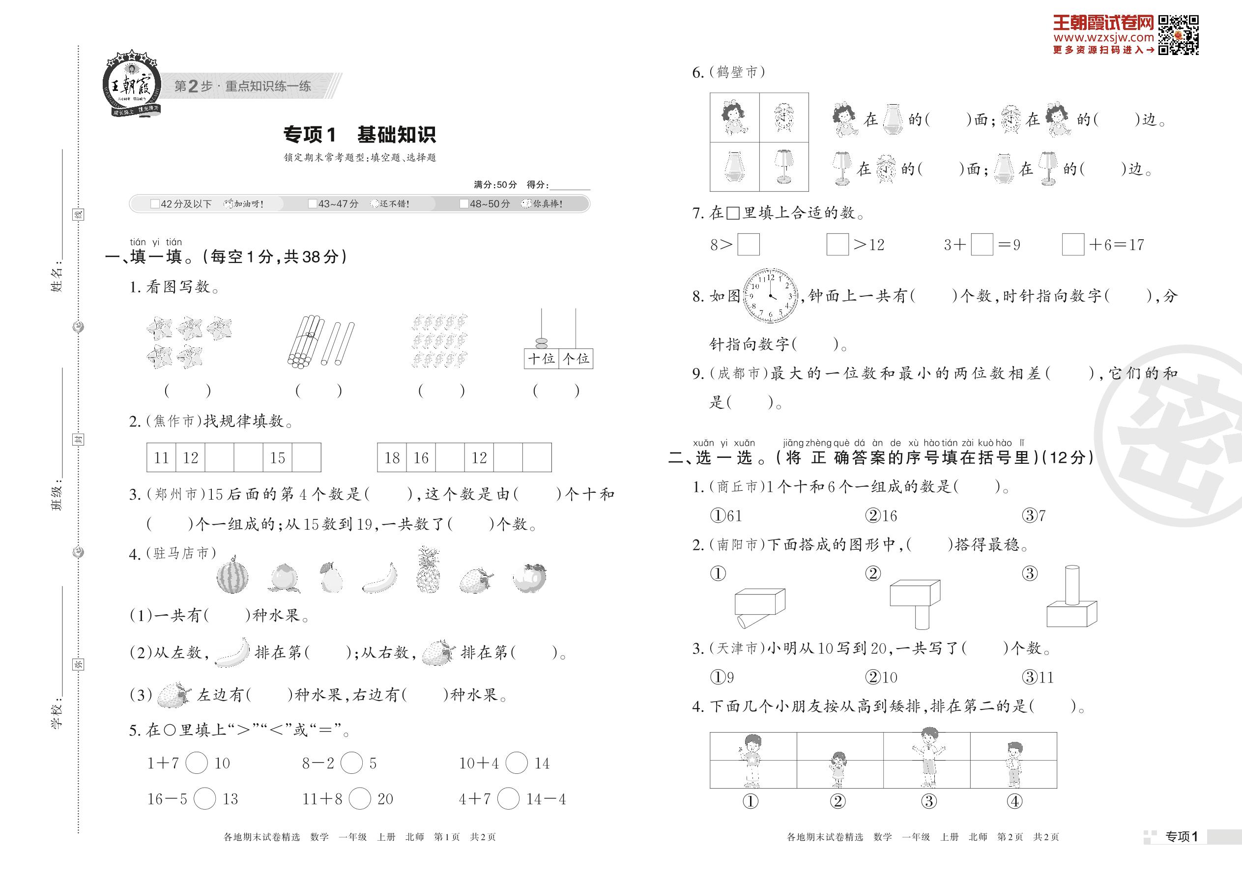 王朝霞期末专项卷——基础知识一年级上册数学(北师版)【1】