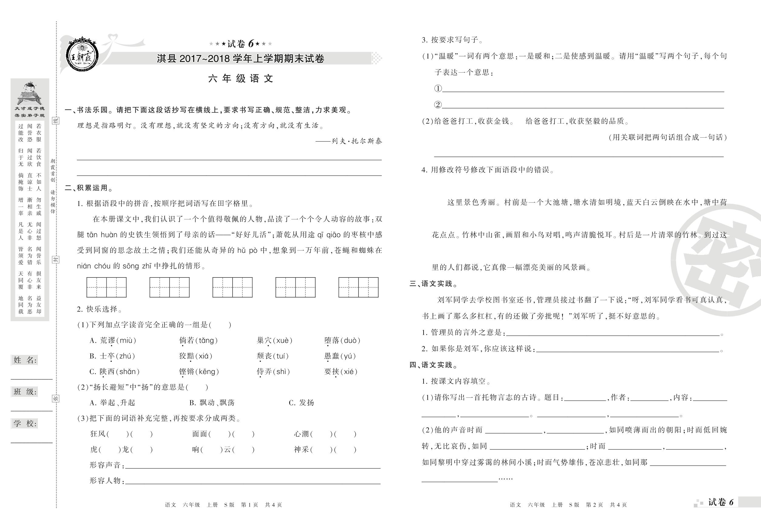 2017-2018学年第一学期鹤壁市淇县六年级语文试卷(S版)【6】