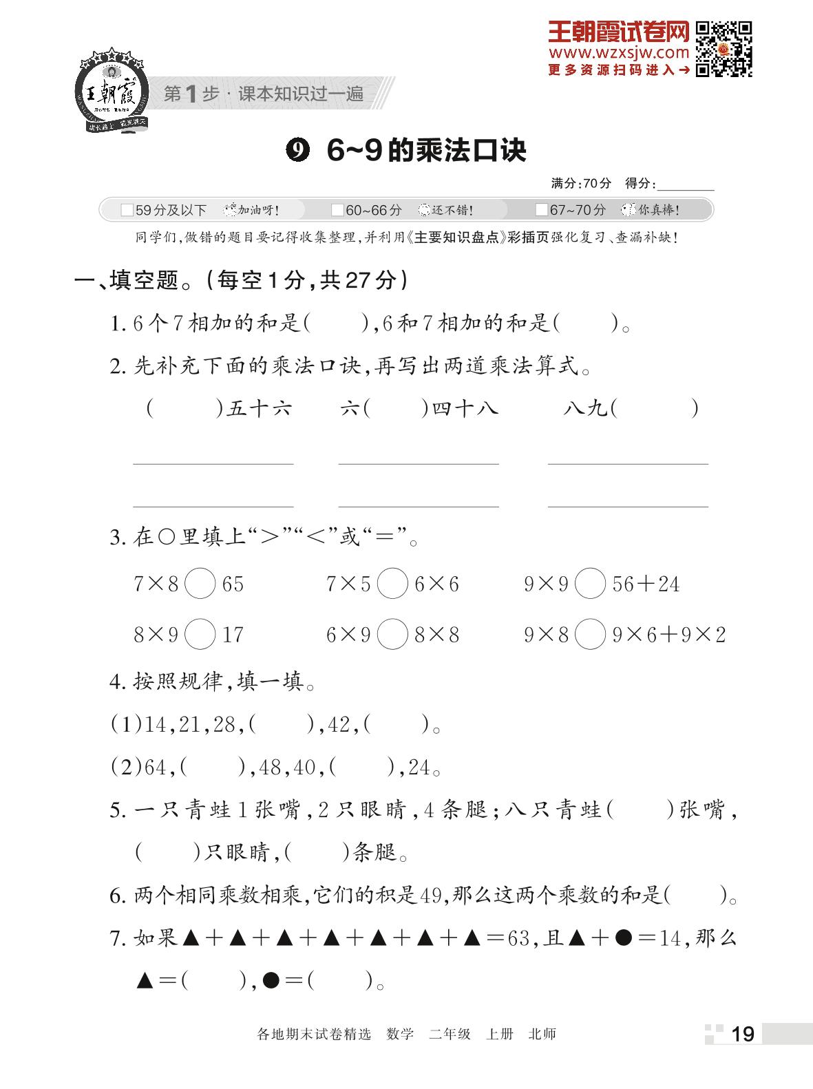 王朝霞期末过课本——9 6~9的乘法口诀二年级上册数学(北师版)