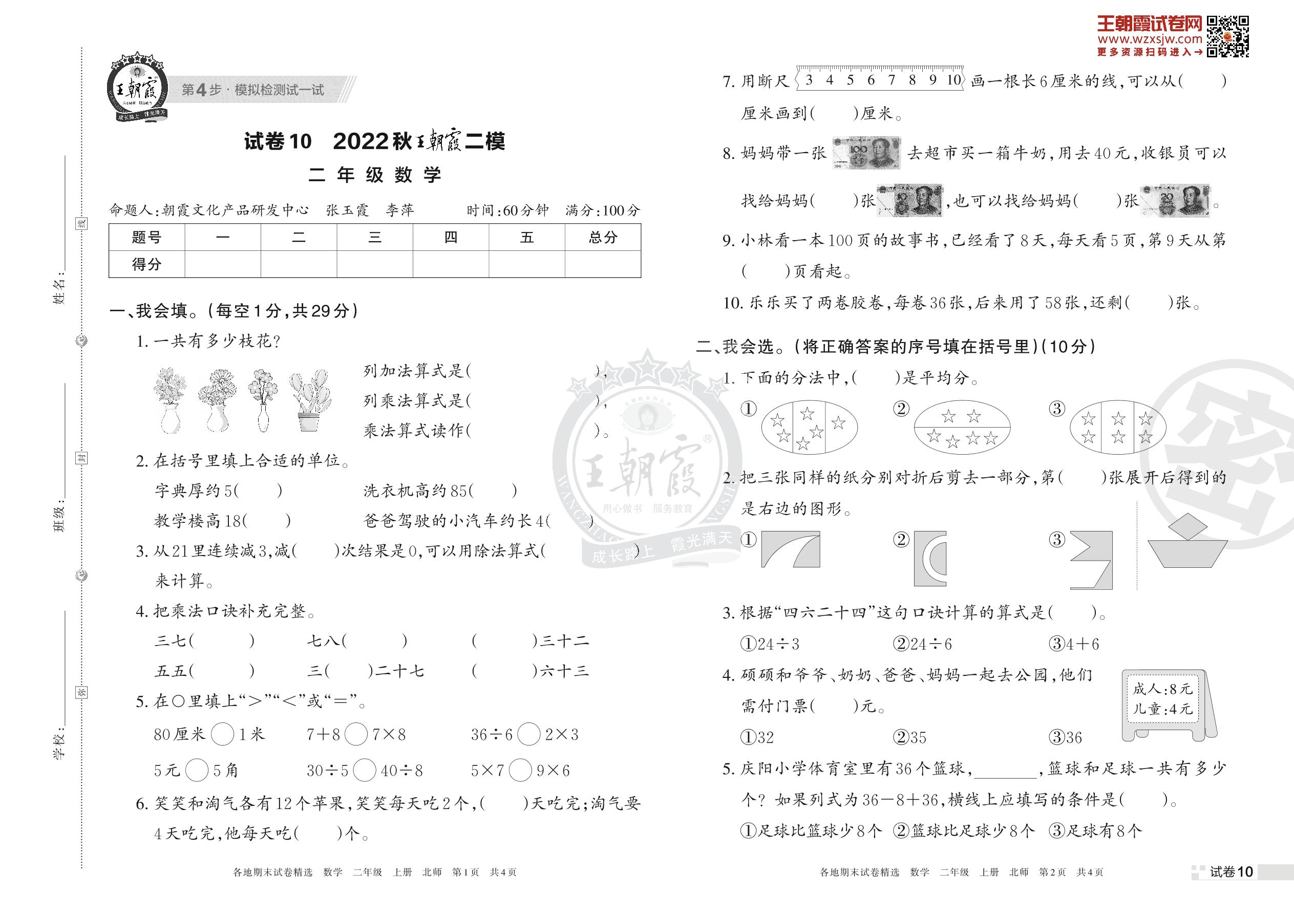 王朝霞期末模拟卷二年级上册数学(北师版)_R221122140225016【10】