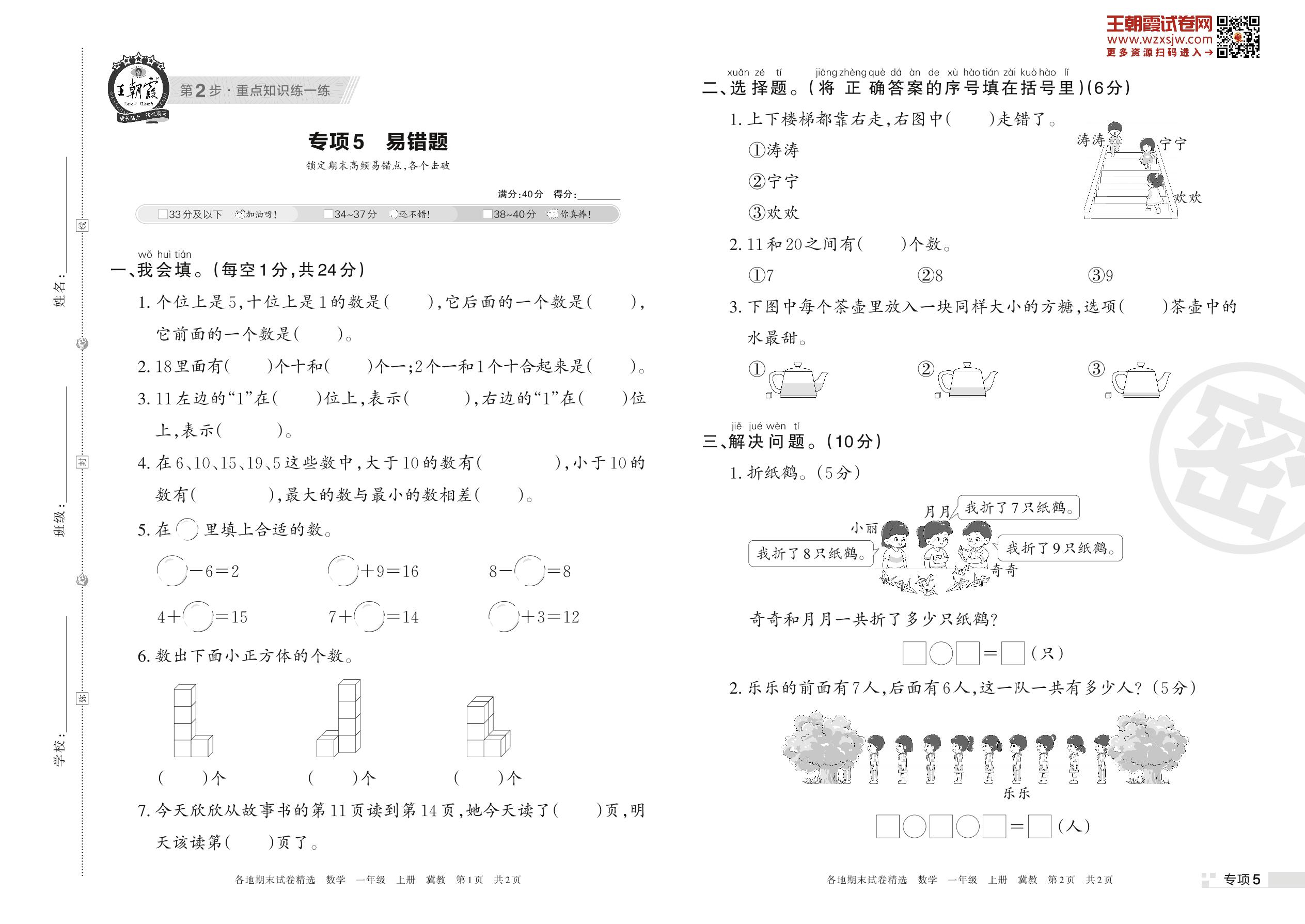 王朝霞期末专项卷——易错题一年级上册数学(冀教版)【5】