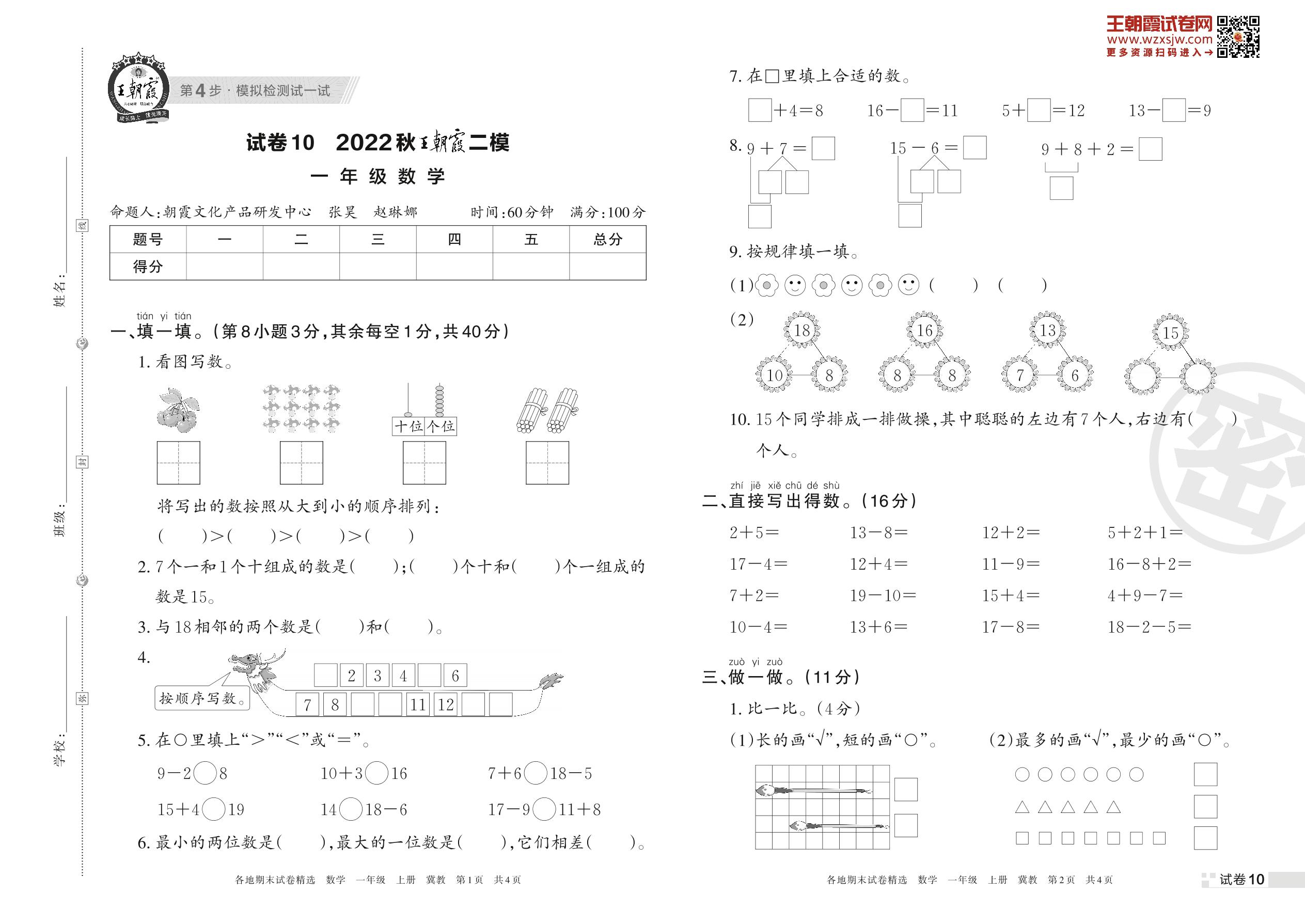 王朝霞期末模拟卷一年级上册数学(冀教版)【10】