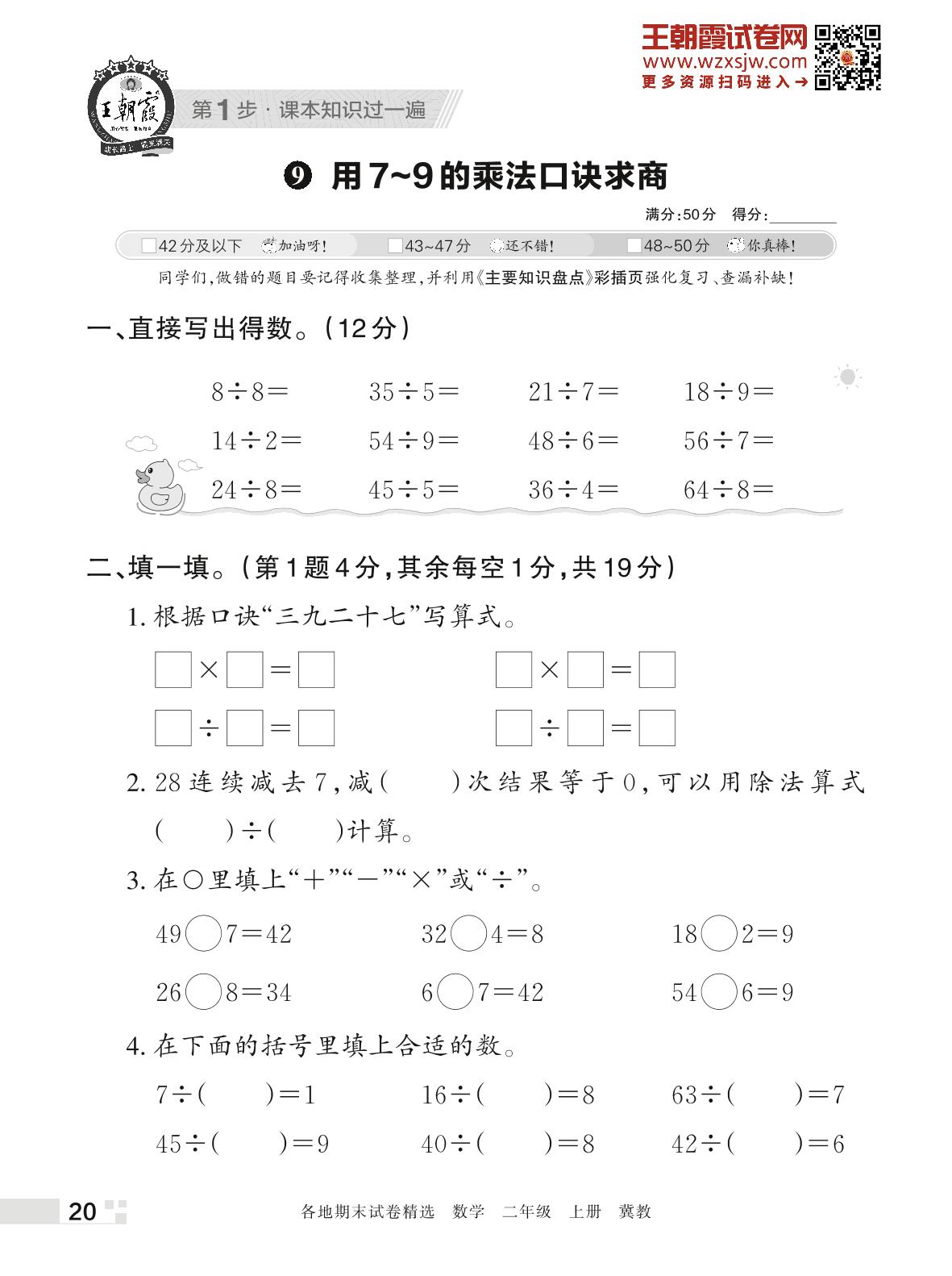 王朝霞期末过课本——9 用7~9的乘法口诀求商二年级上册数学(冀教版)