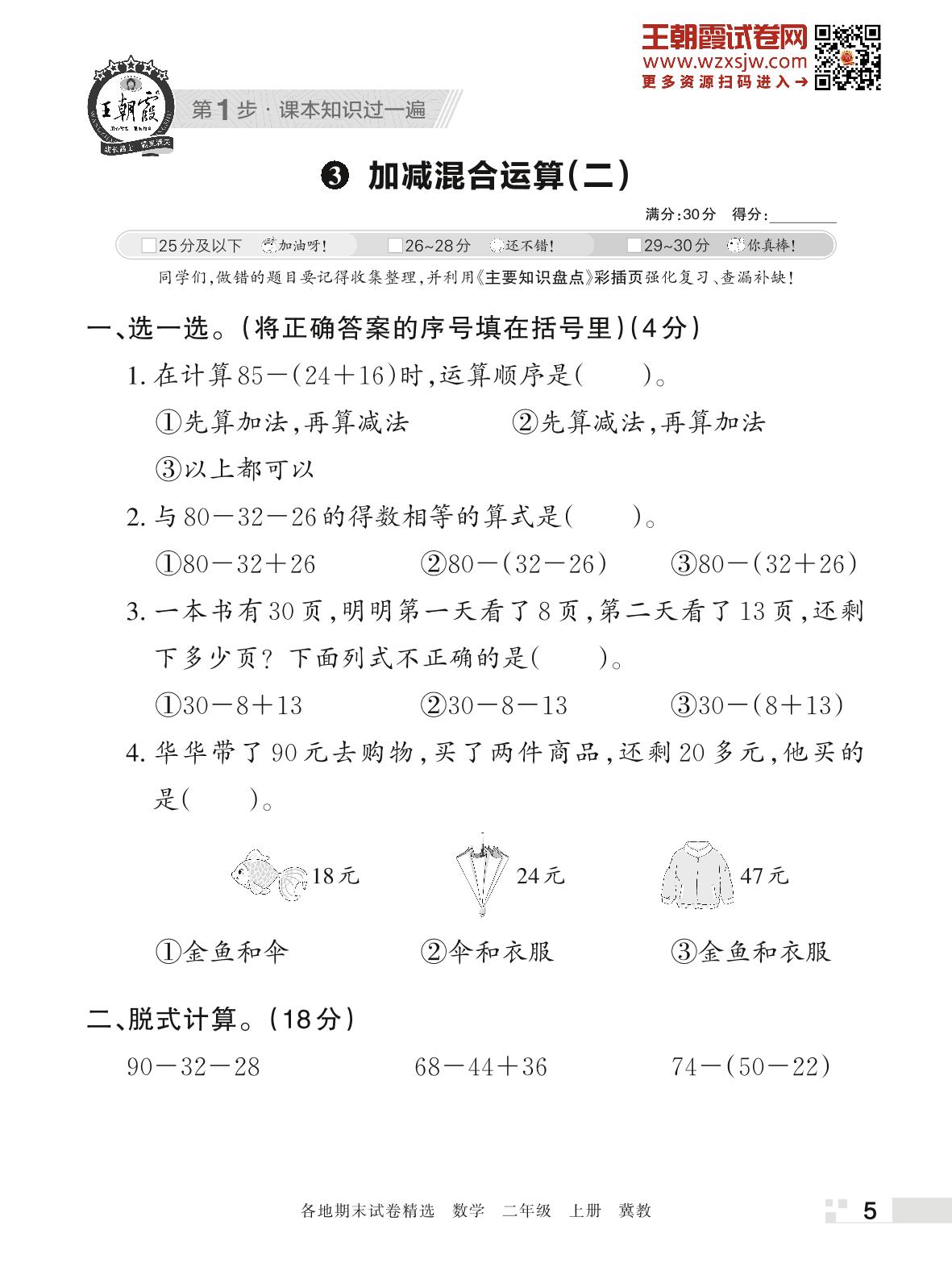 王朝霞期末过课本——3 加减混合运算(二)二年级上册数学(冀教版)