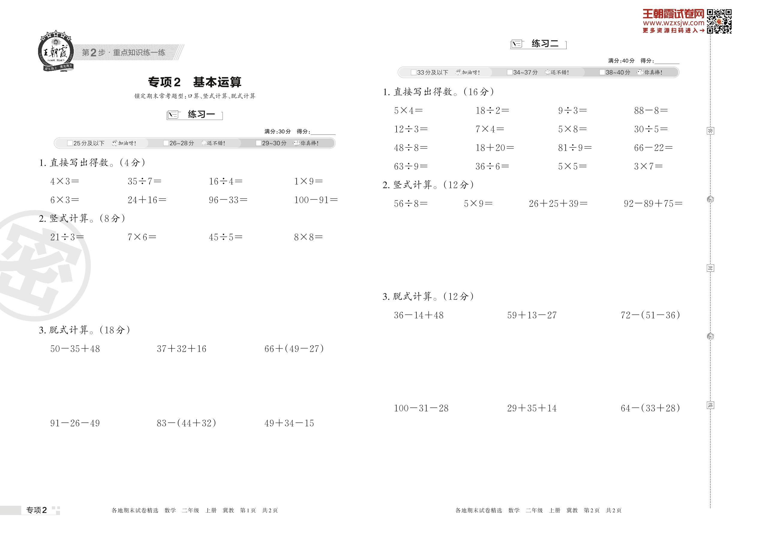 王朝霞期末专项卷——基本运算二年级上册数学(冀教版)【2】