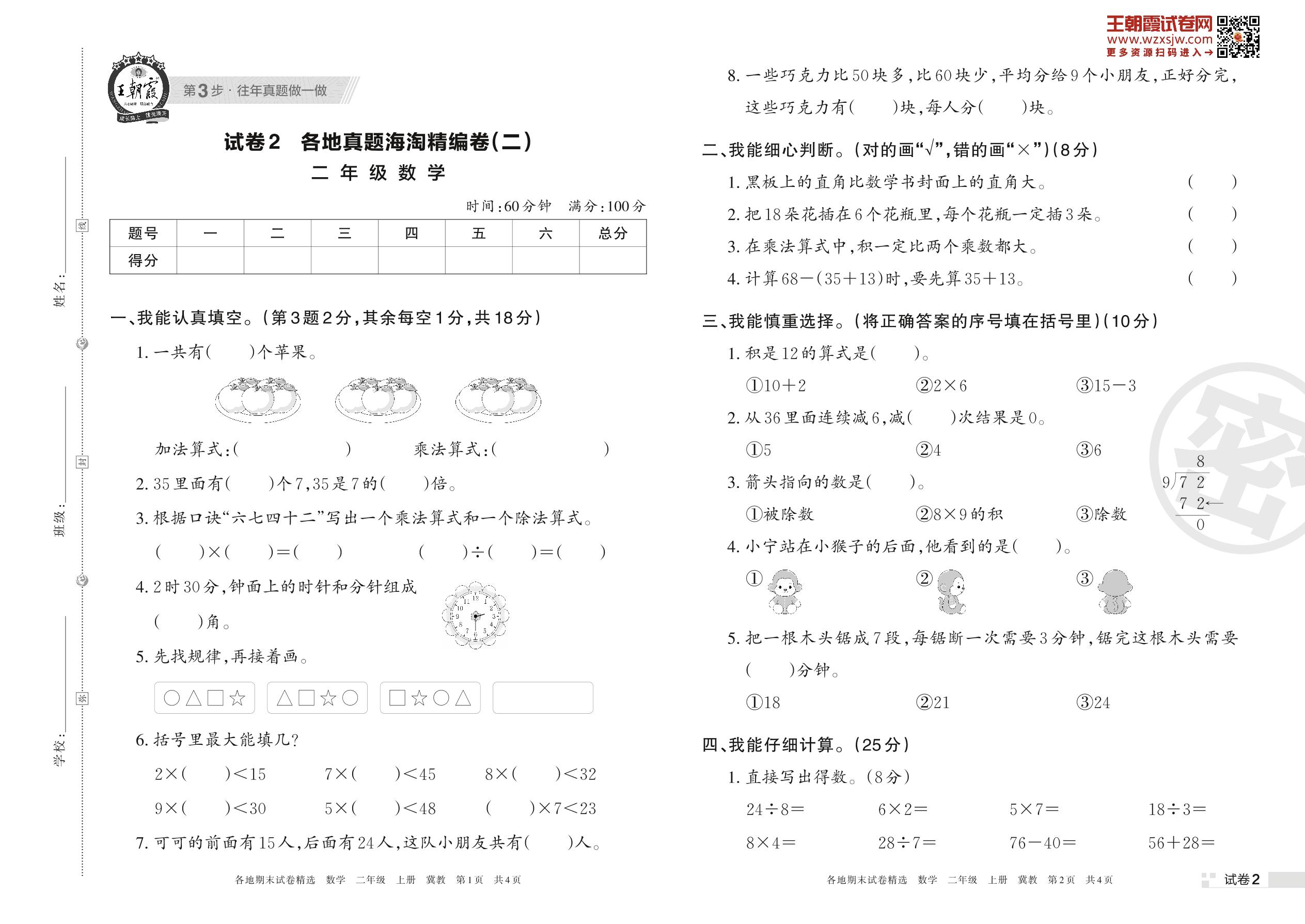 二年级数学冀教版上册期末卷