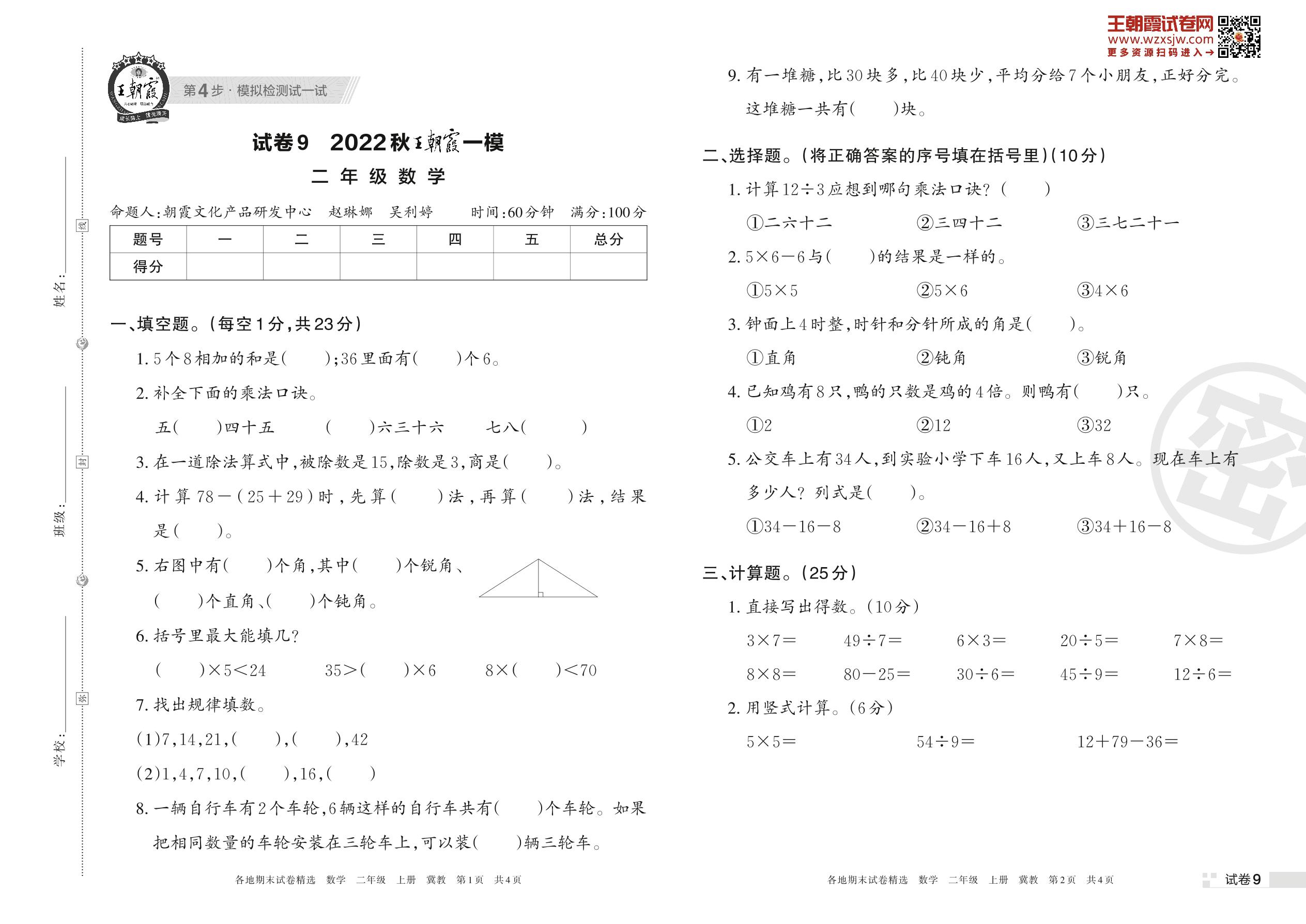 王朝霞期末模拟卷二年级上册数学(冀教版)_R221122142002800【9】