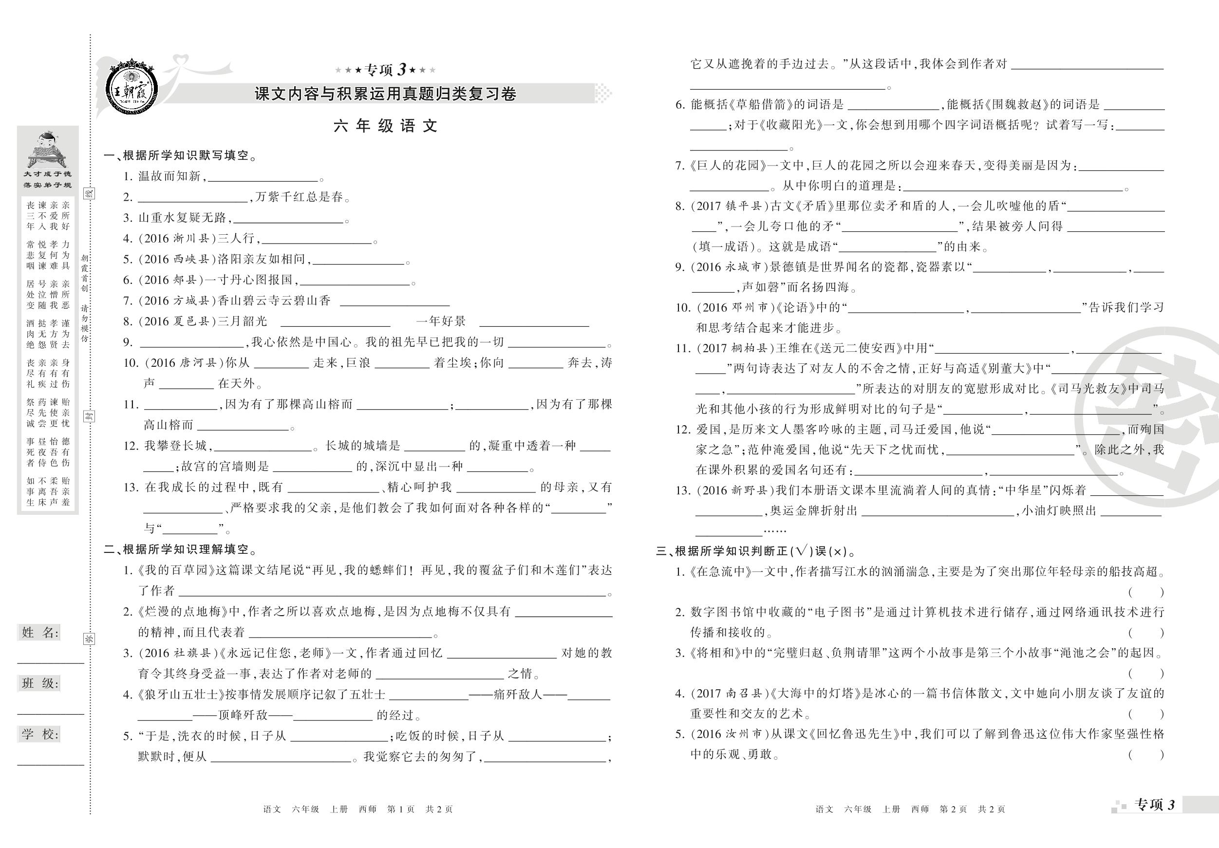 王朝霞期末专项卷——课文内容与积累运用、课内阅读与写作真题归类复习卷六年级上册语文(西师版)_R210802114924【0】