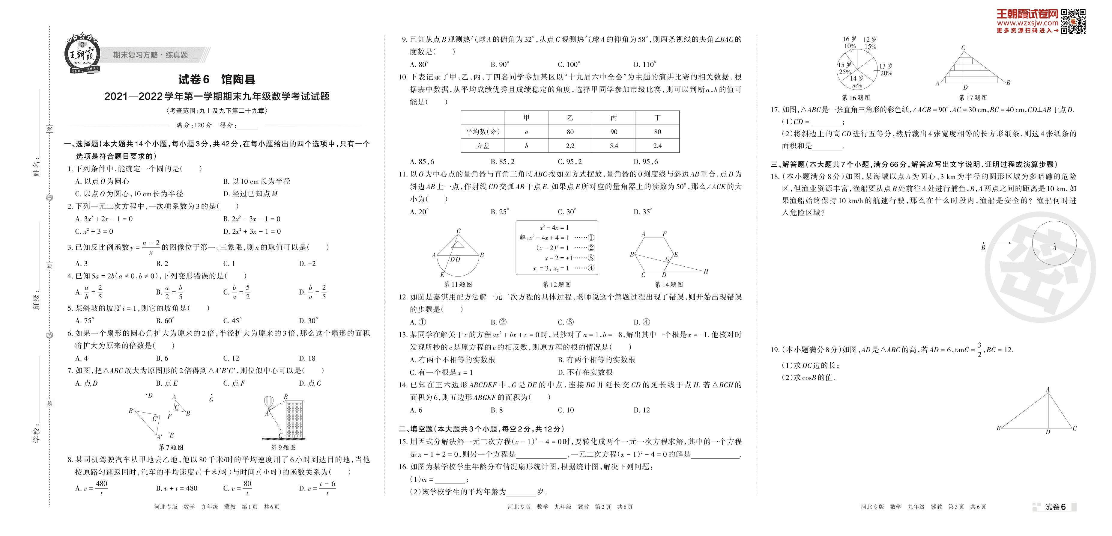 馆陶县2021—2022学年第一学期期末九年级数学考试试题(冀教版)【6】