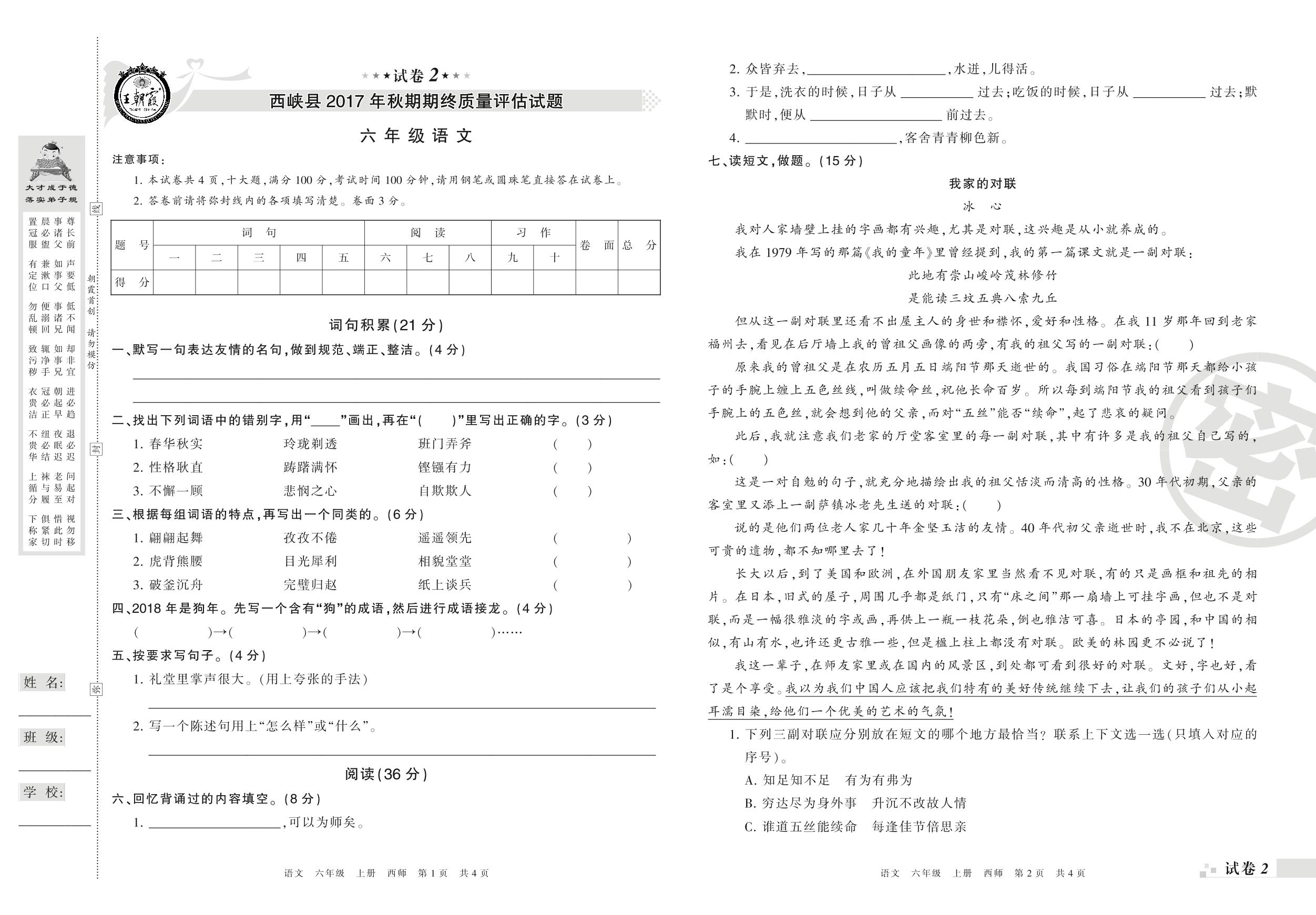 2017-2018学年第一学期南阳市西峡县六年级语文试卷(西师版)【2】