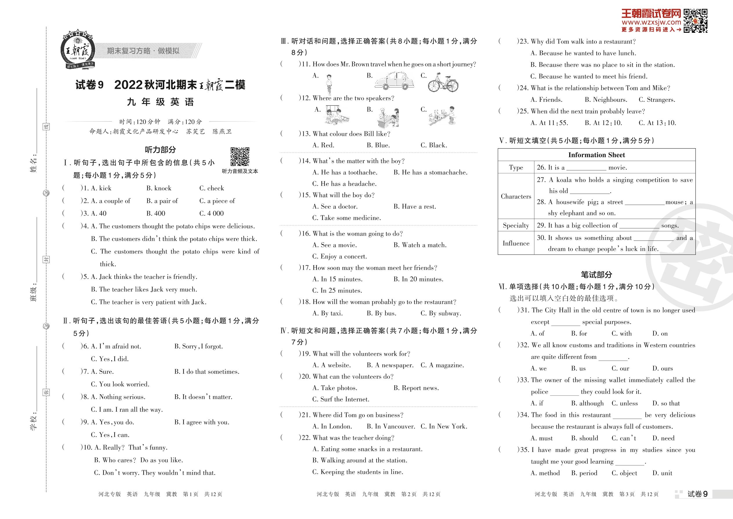 2022-2023学年第一学期王朝霞期末模拟卷九年级英语(冀教版)_R221122150215312【9】