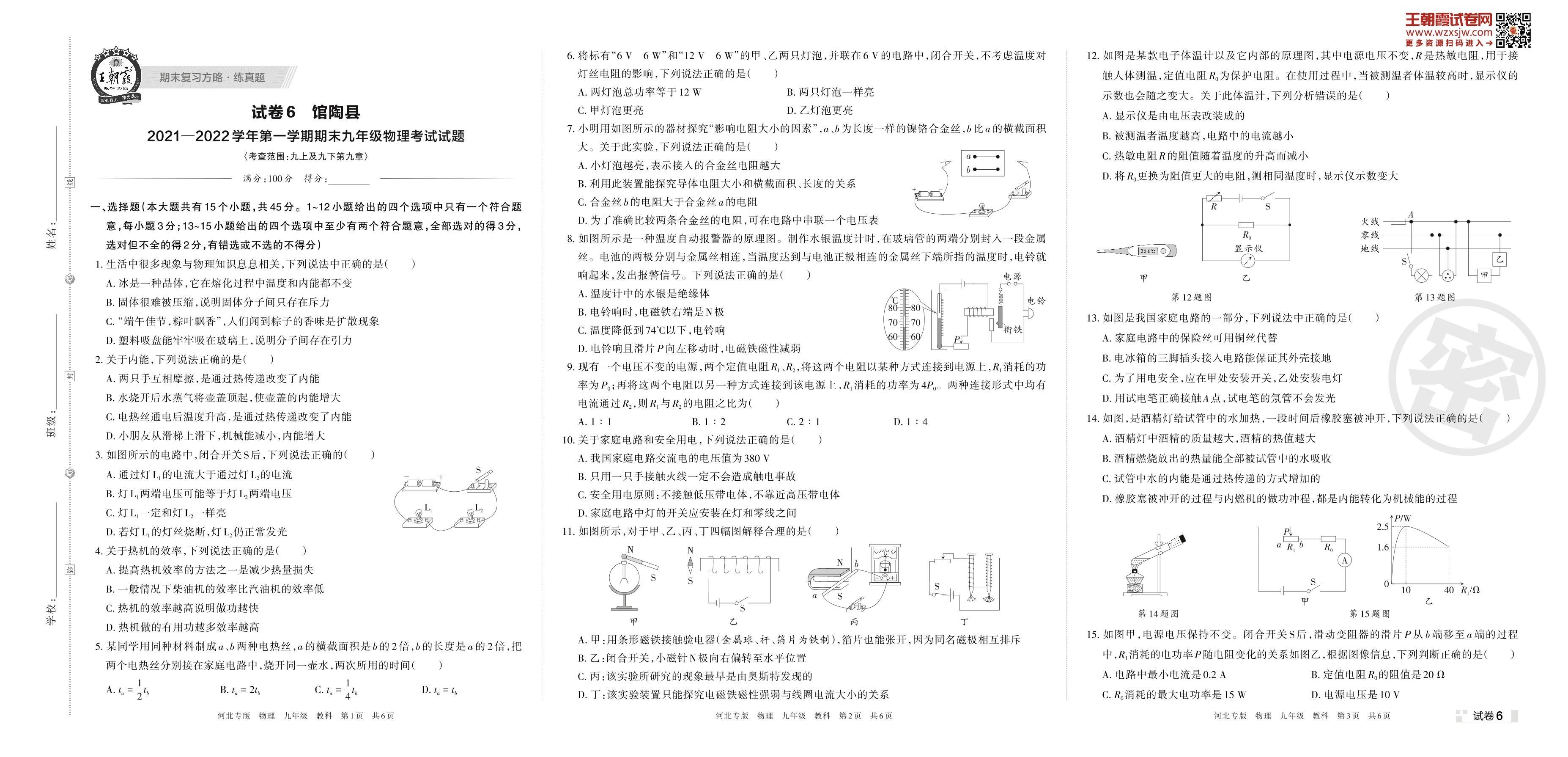 馆陶县2021—2022学年第一学期期末九年级物理考试试题(教科版)【6】