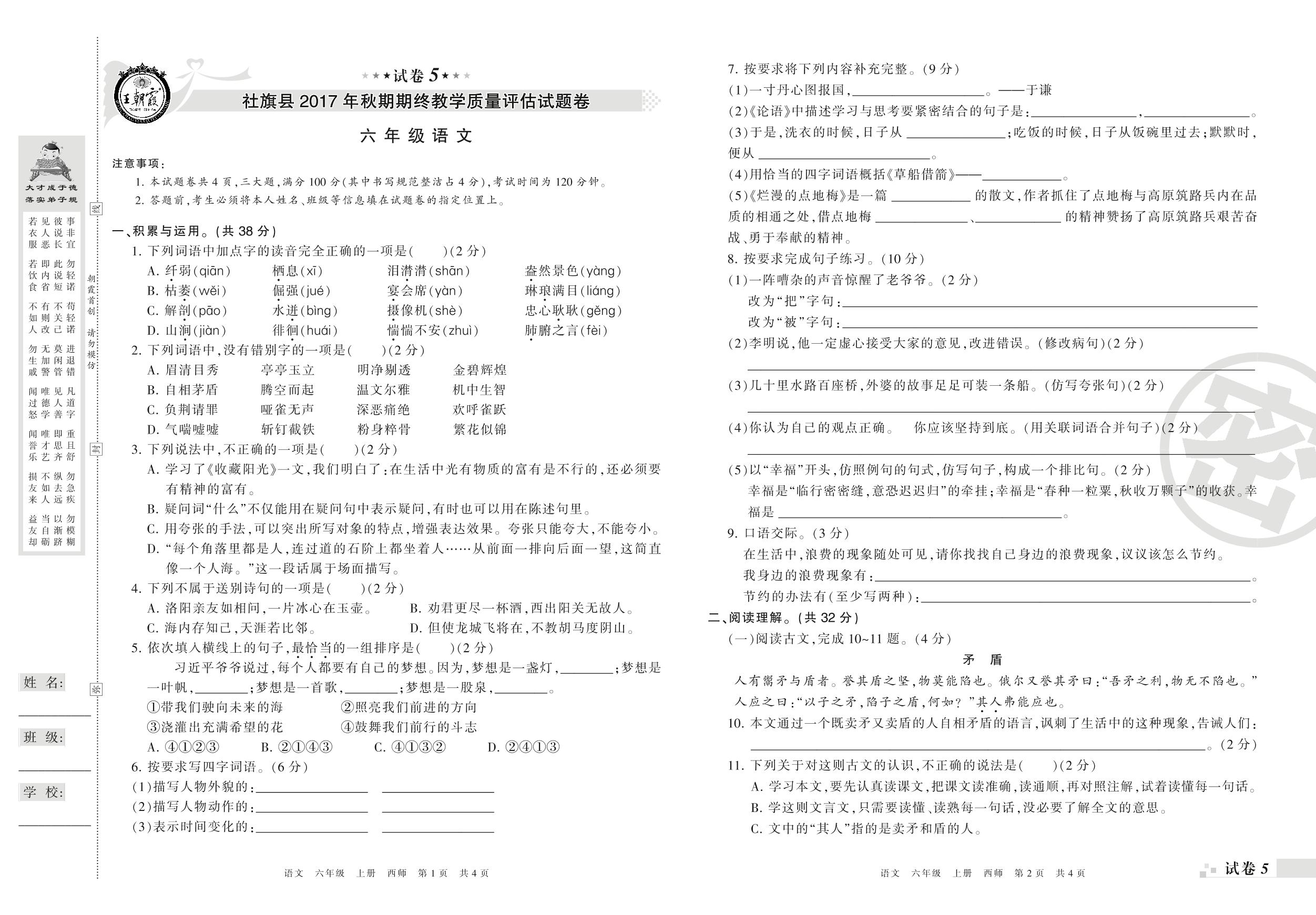 2017-2018学年第一学期南阳市社旗县六年级语文试卷(西师版)【5】