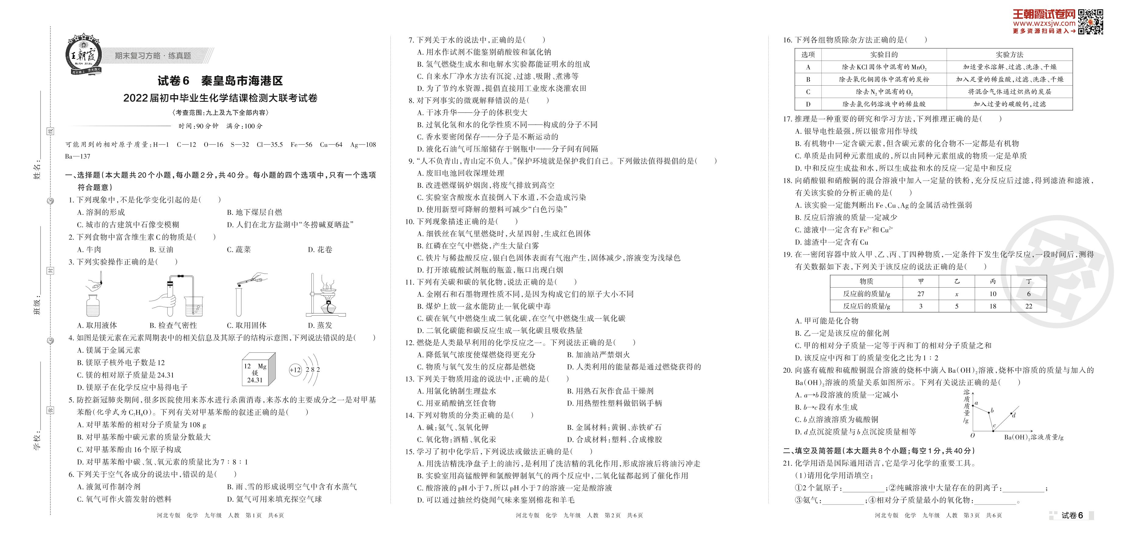 秦皇岛市海港区2022届初中毕业生化学结课检测大联考试卷(人教版)【6】