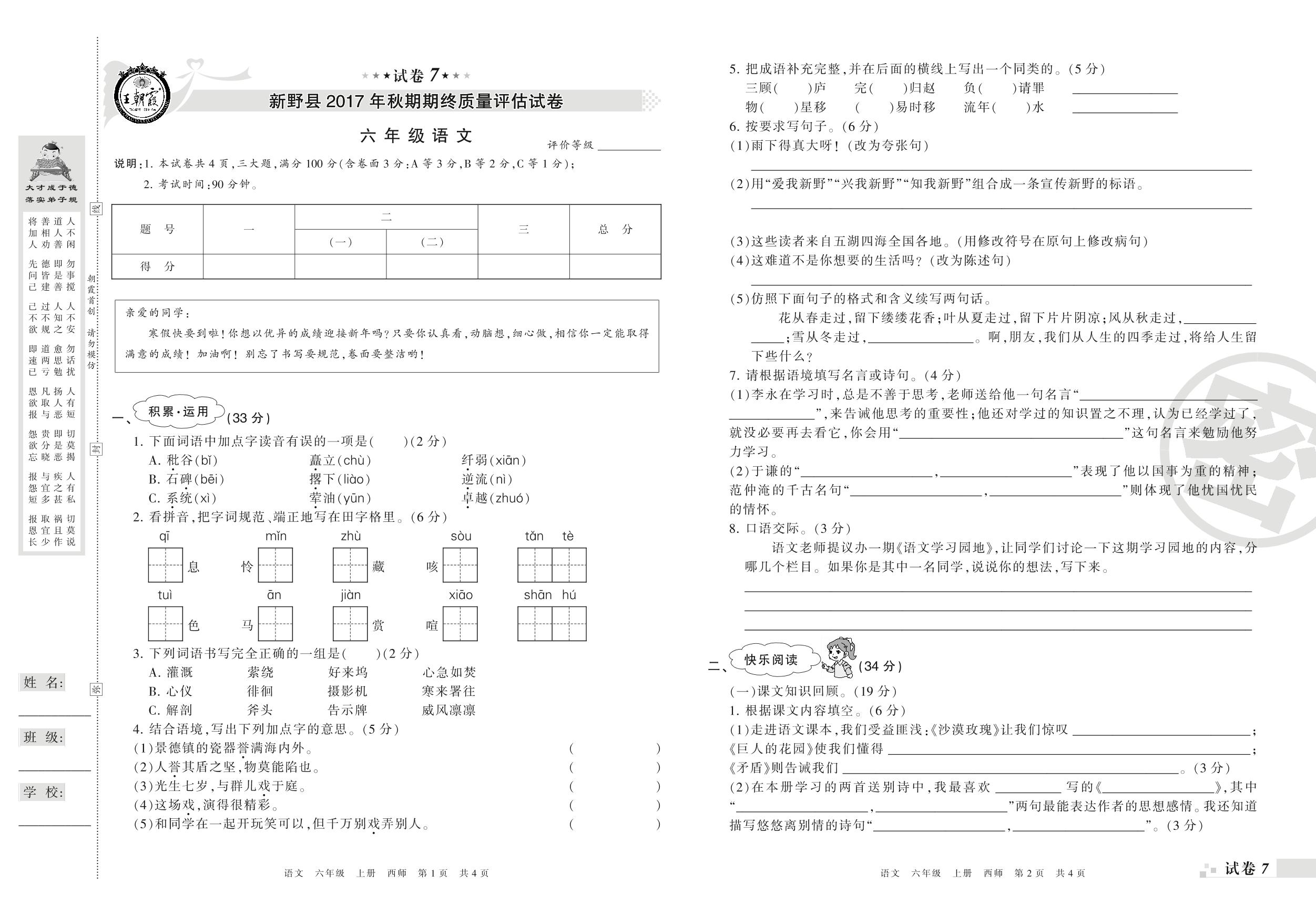 2017-2018学年第一学期南阳市新野县六年级语文试卷(西师版)【7】
