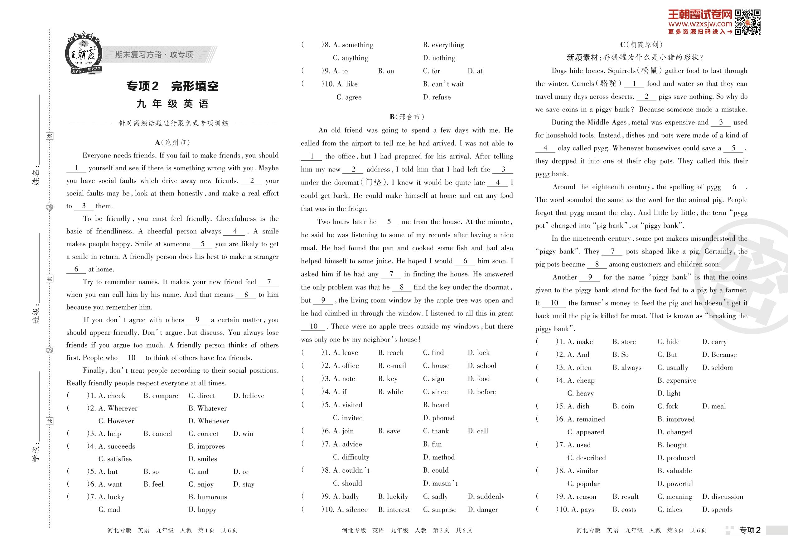 2022-2023学年第一学期王朝霞期末专项卷——完形填空九年级全一册英语(人教版)【2】