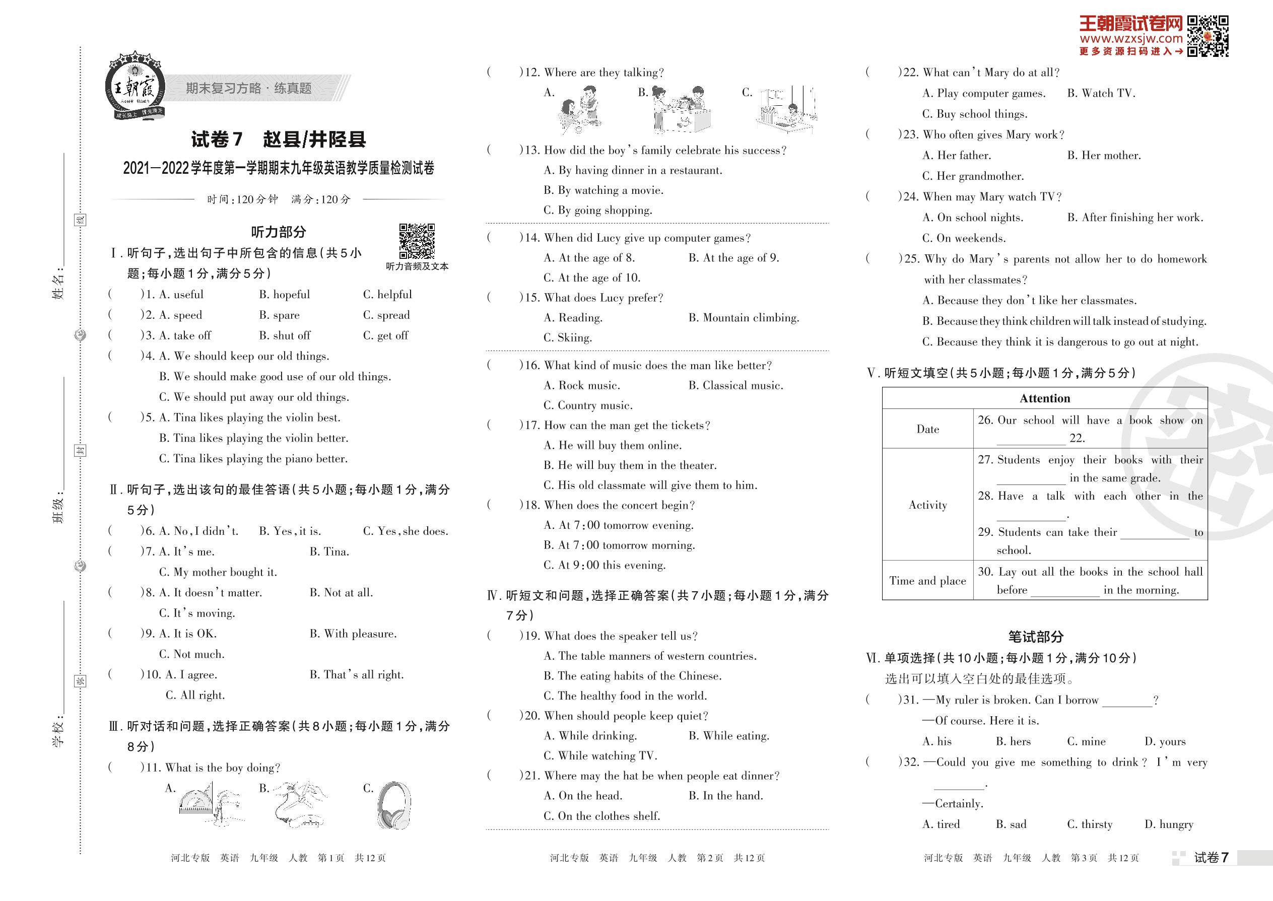 赵县、井陉县2021—2022学年度第一学期期末九年级英语教学质量检测试卷(人教版)【7】