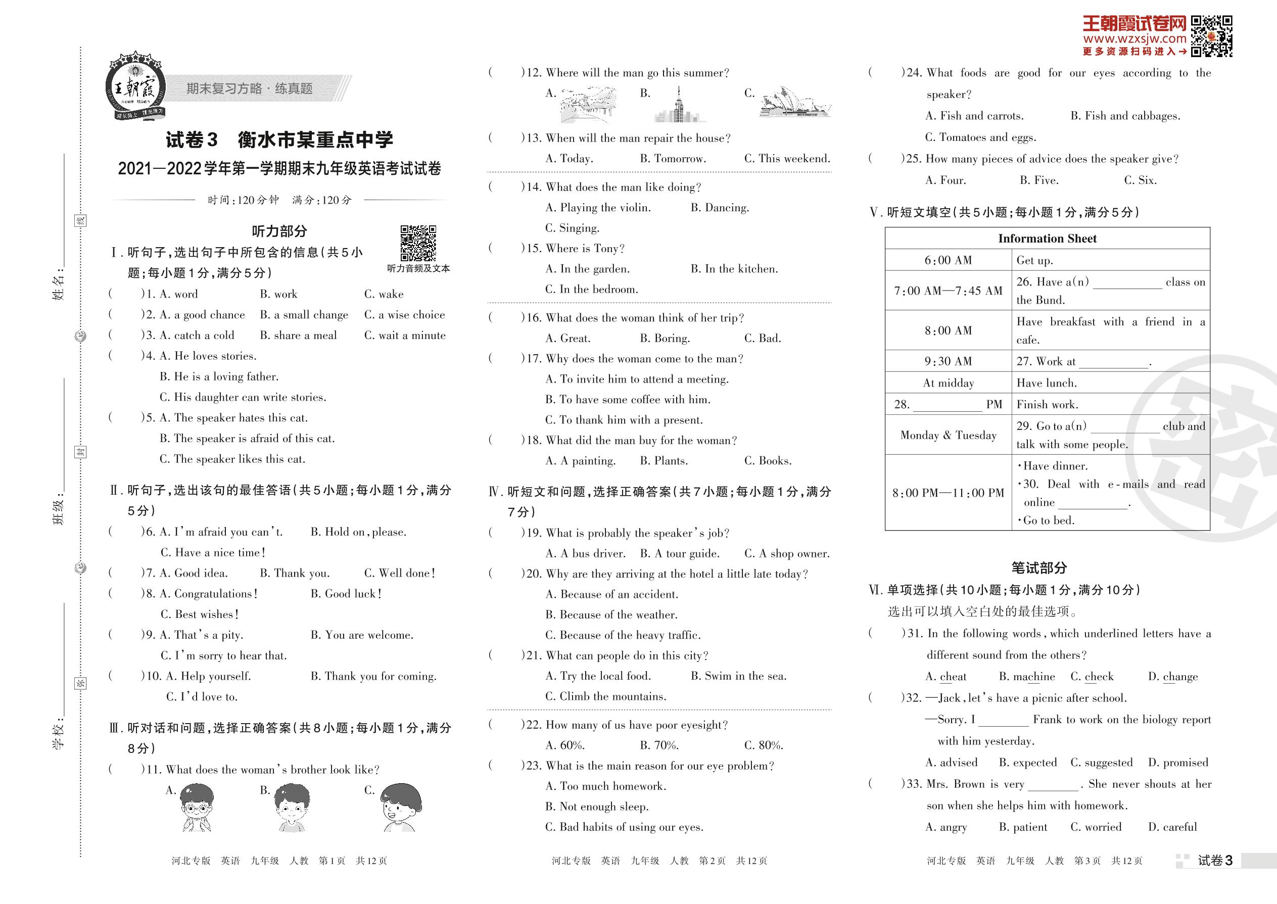 衡水市某重点中学2021—2022学年第一学期期末九年级英语考试试卷(人教版)【3】