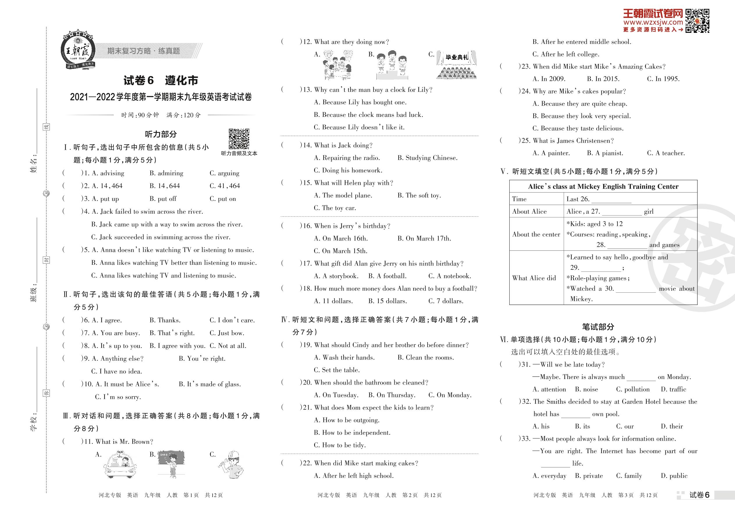 遵化市2021—2022学年度第一学期期末九年级英语考试试卷(人教版)【6】