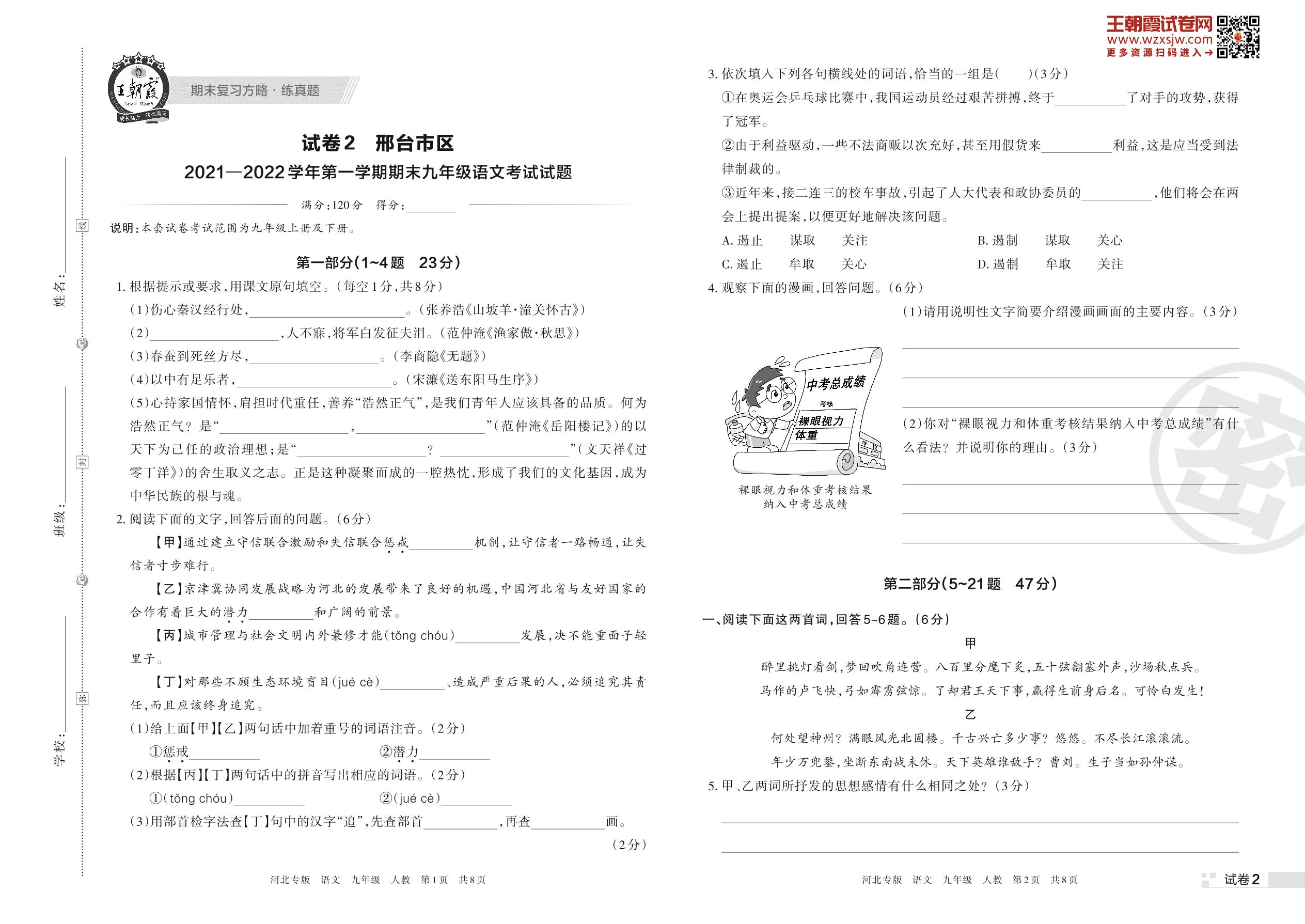 邢台市区2021—2022学年第一学期期末九年级语文考试试题(人教版)【2】