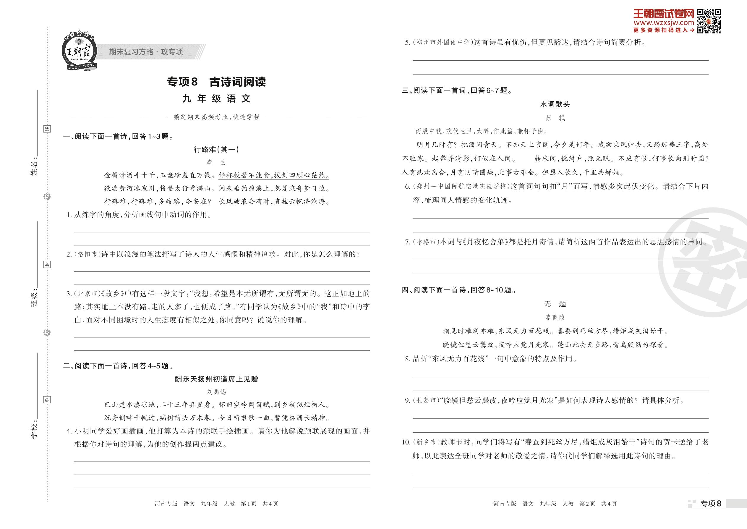 王朝霞期末专项卷——古诗词阅读九年级上册语文(人教版)【8】