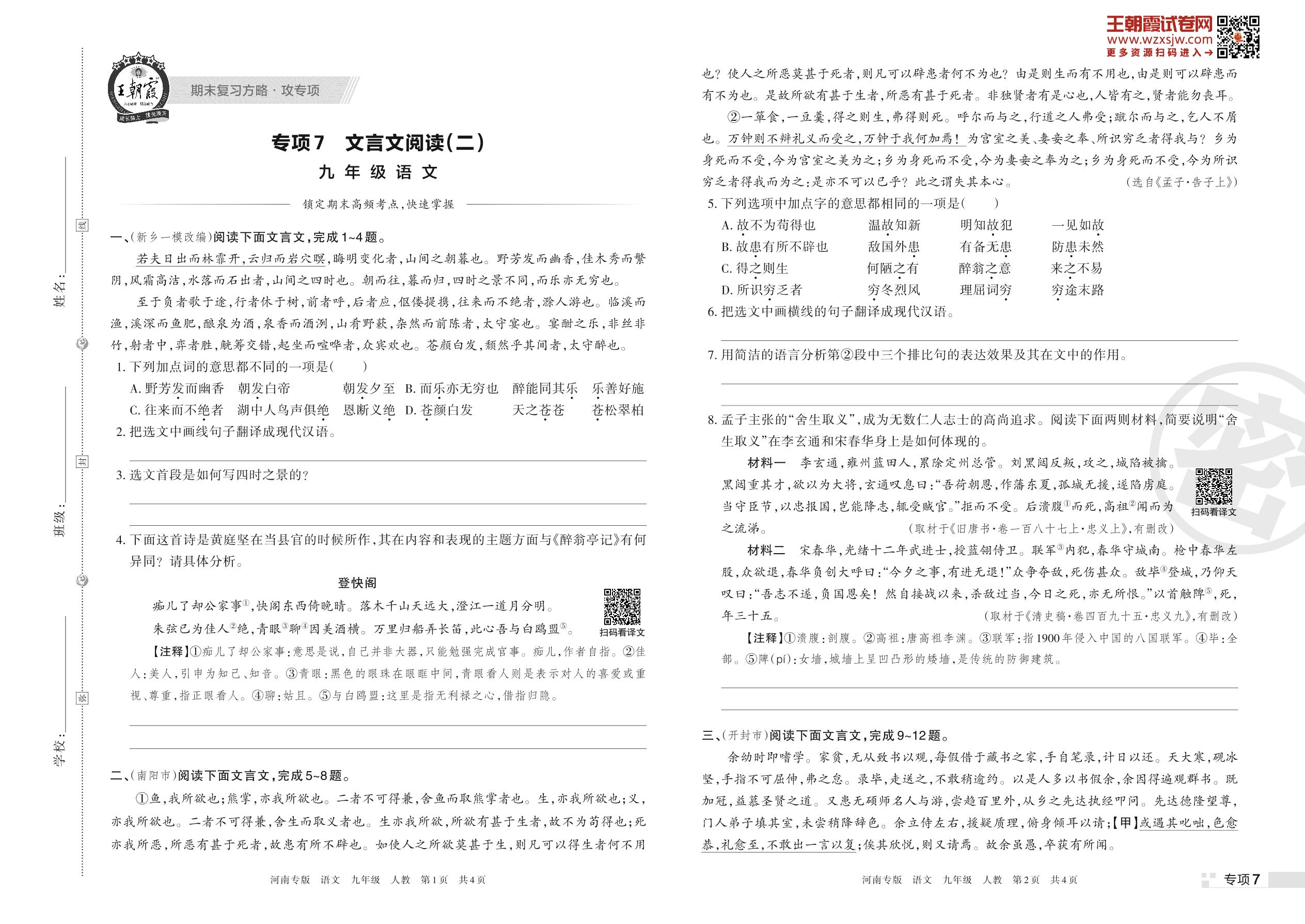 王朝霞期末专项卷——文言文阅读(二)九年级上册语文(人教版)【7】