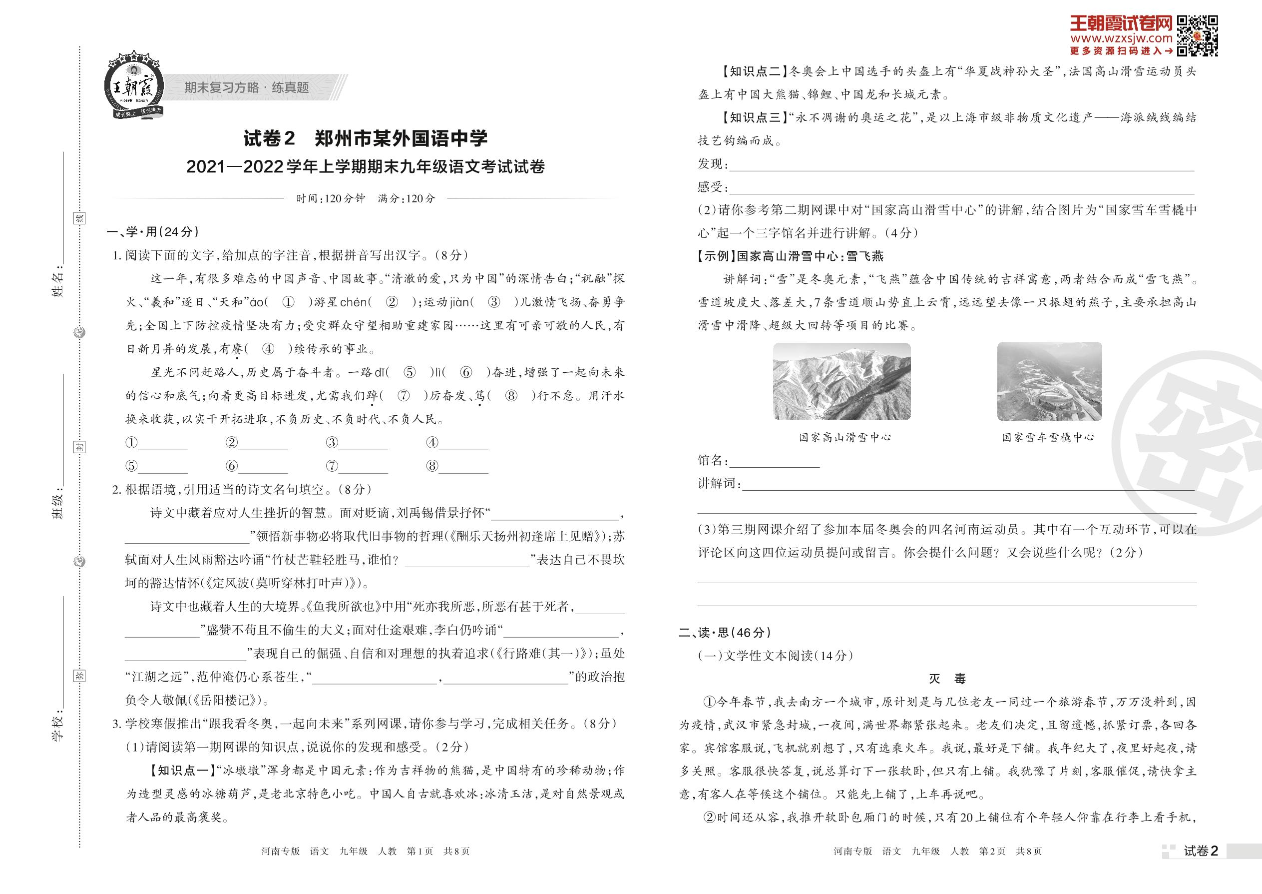 郑州市某外国语中学2021—2022学年上学期期末九年级语文考试试卷(人教版)【2】