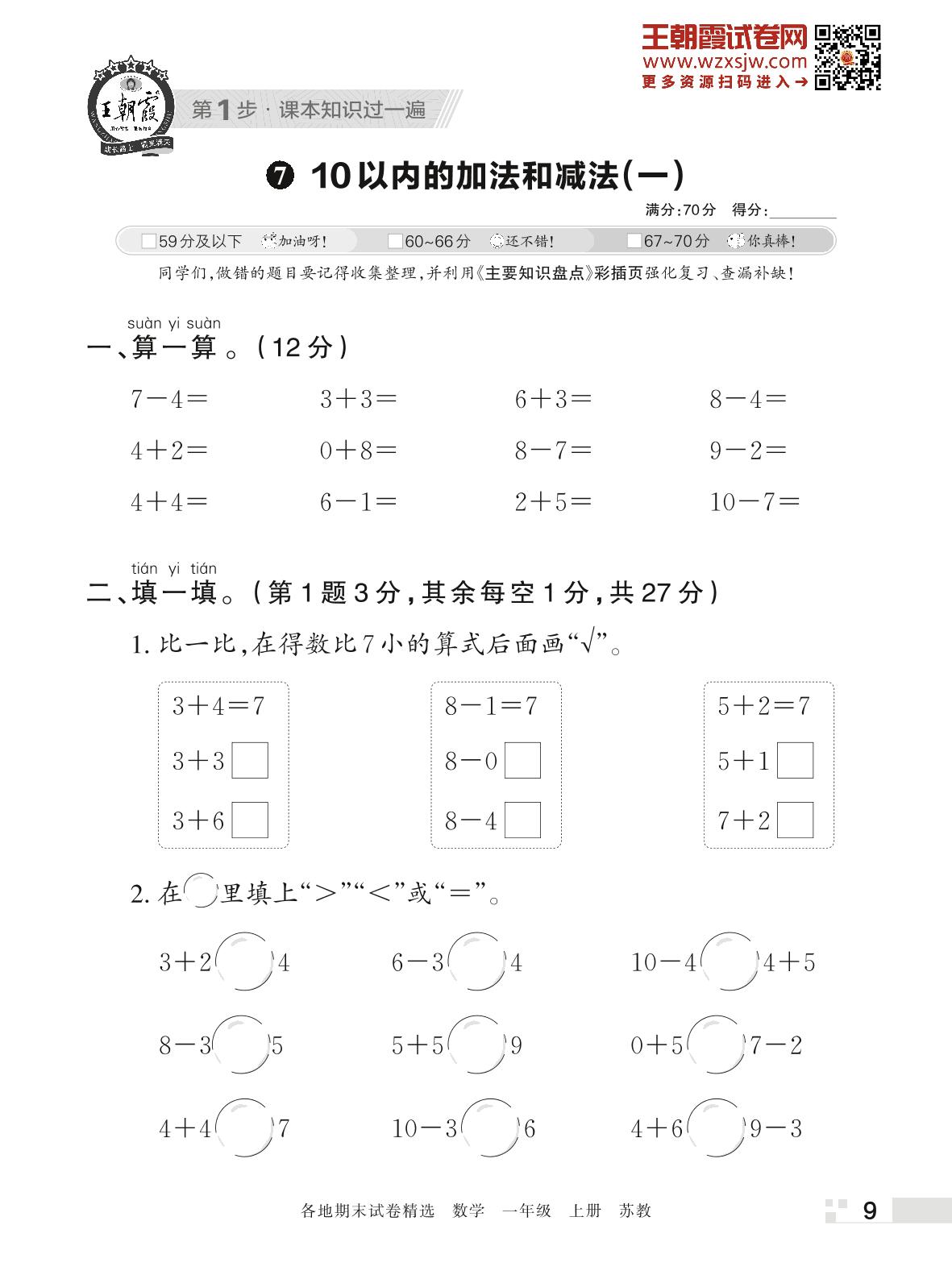王朝霞期末过课本——7 10以内的加法和减法(一)一年级上册数学(苏教版)