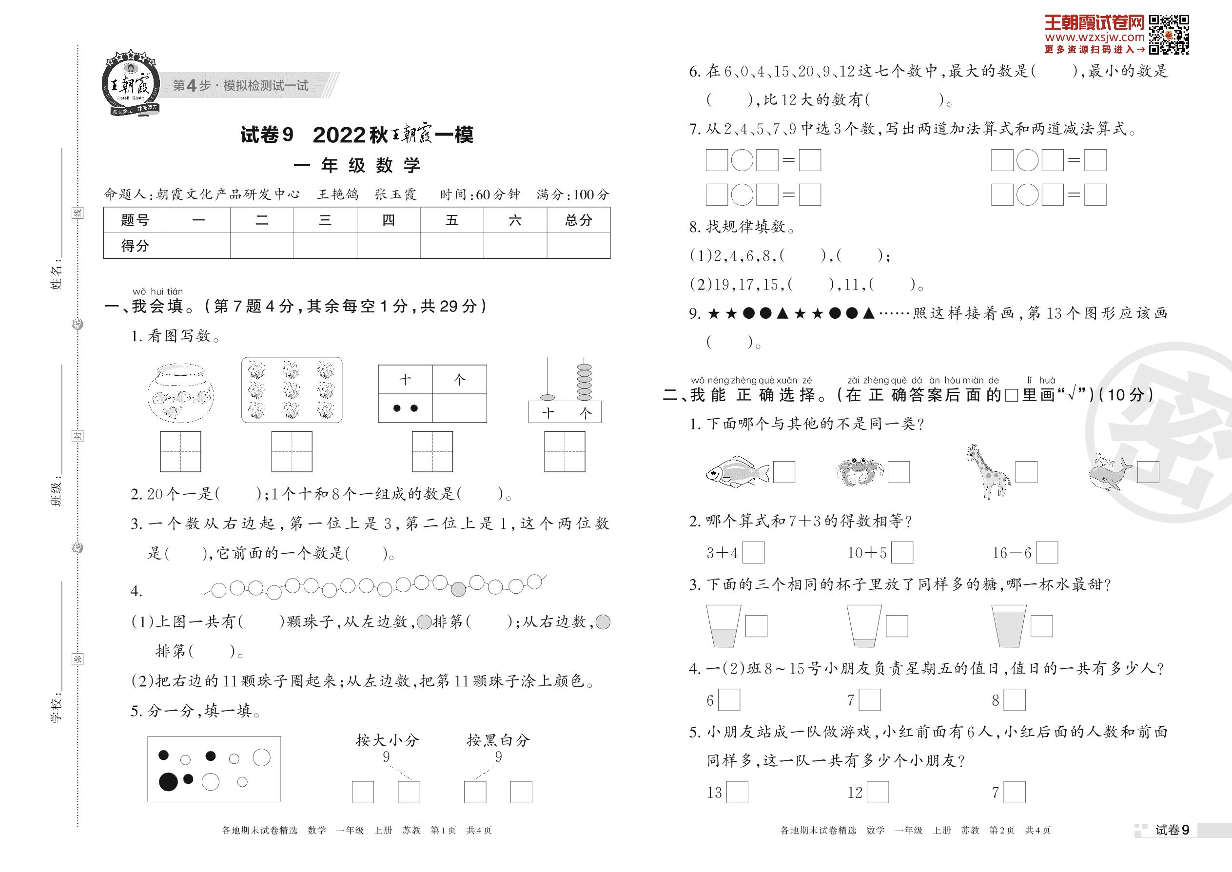 王朝霞期末模拟卷一年级上册数学(苏教版)_R221122161153768【9】