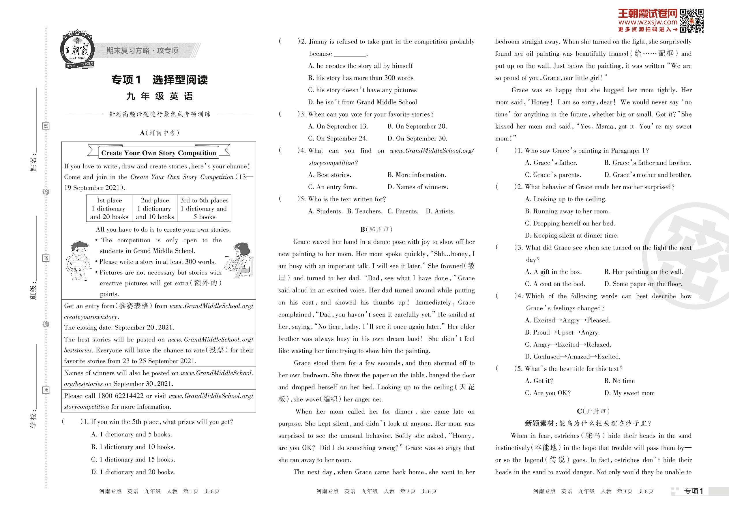 王朝霞期末专项卷——选择型阅读九年级上册英语(人教版)【1】