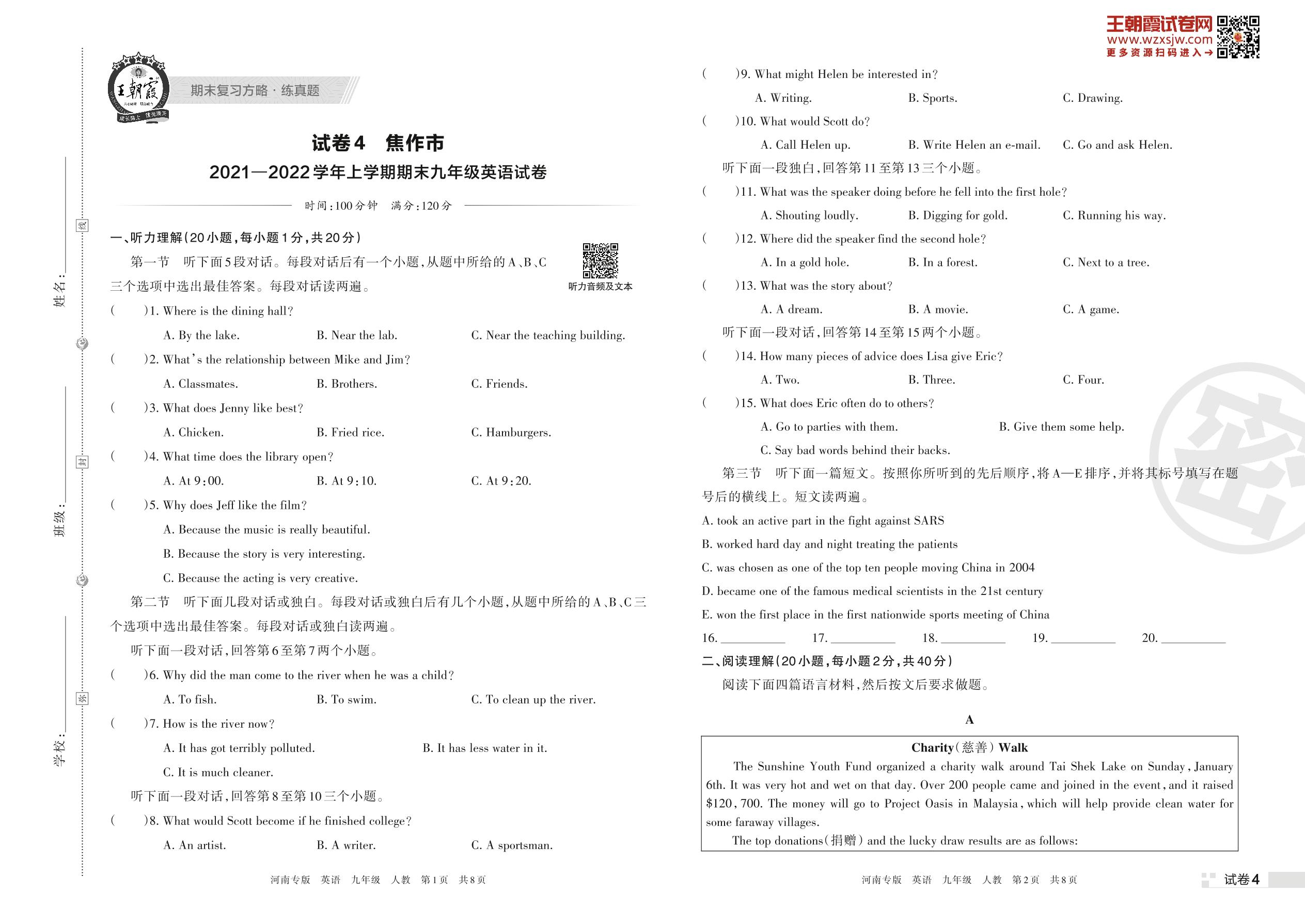 焦作市2021—2022学年上学期期末九年级英语试卷(人教版)【4】