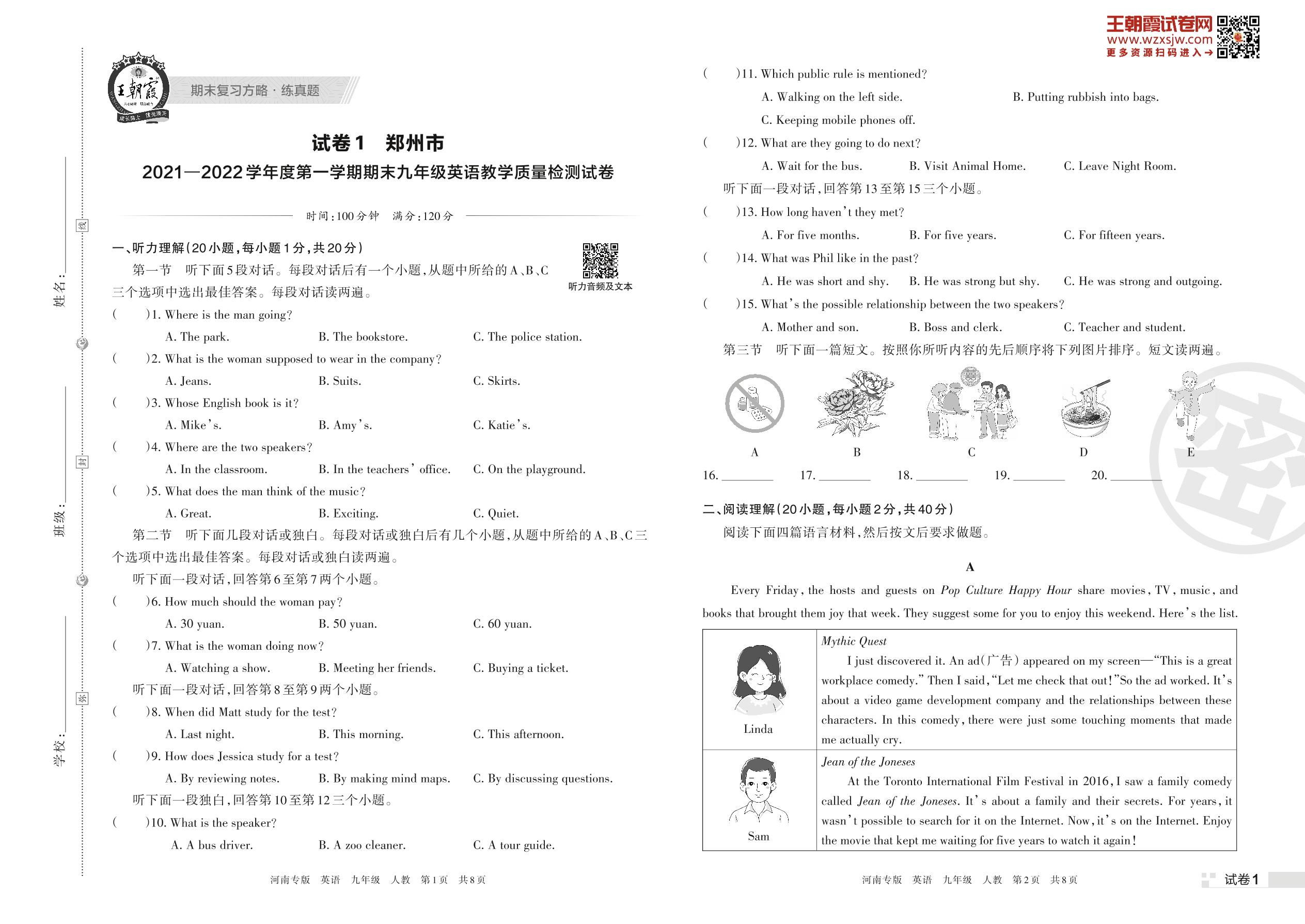 郑州市2021—2022学年度第一学期期末九年级英语教学质量检测试卷(人教版)【1】