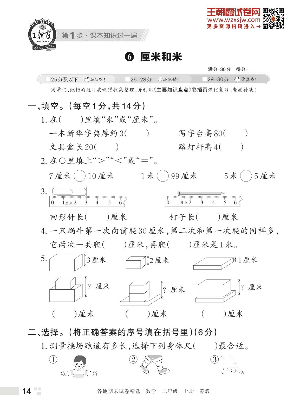 王朝霞期末过课本——6 厘米和米二年级上册数学(苏教版)