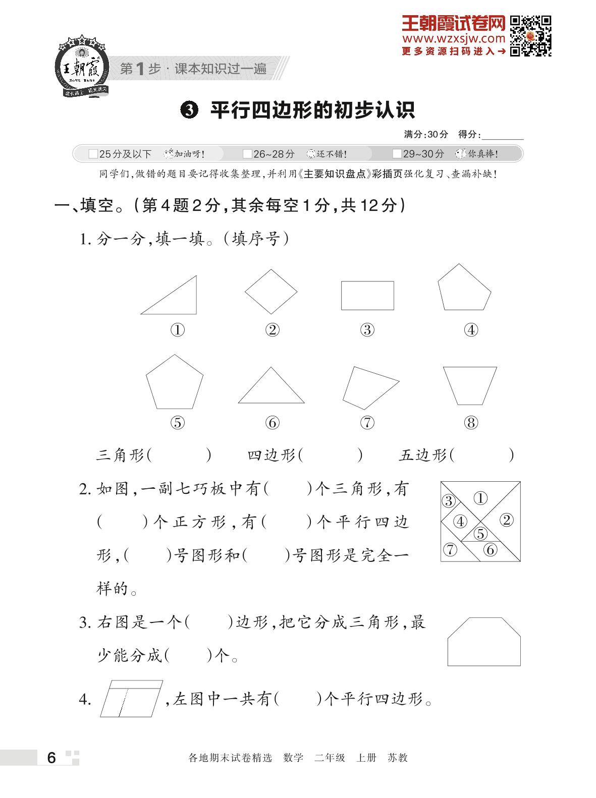 王朝霞期末过课本——3 平行四边形的初步认识二年级上册数学(苏教版)