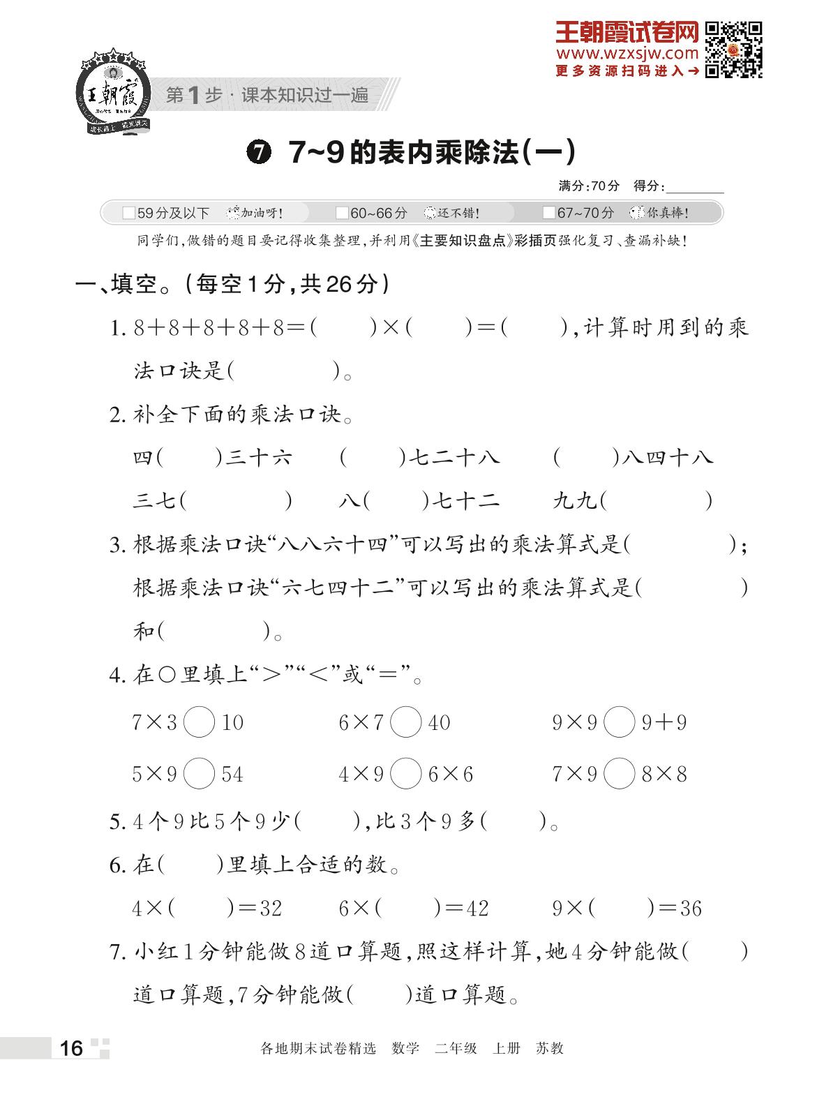 王朝霞期末过课本——7 7~9的表内乘除法(一)二年级上册数学(苏教版)