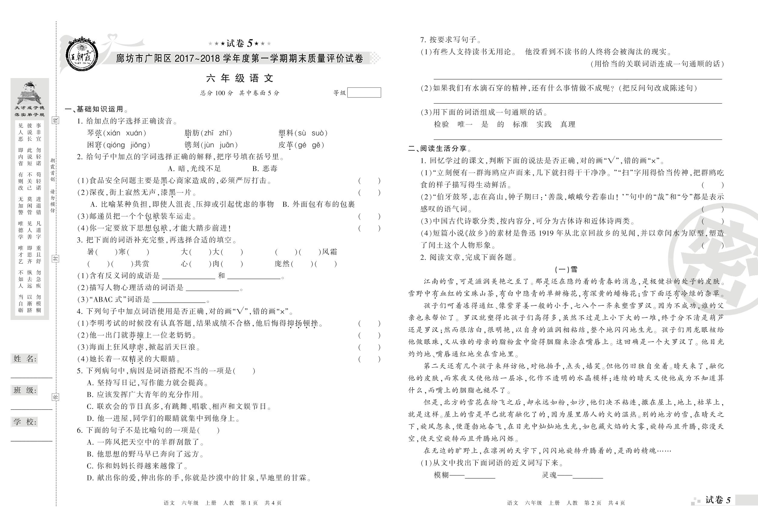2017-2018学年第一学期廊坊市广阳区六年级语文试卷(人教版)【5】