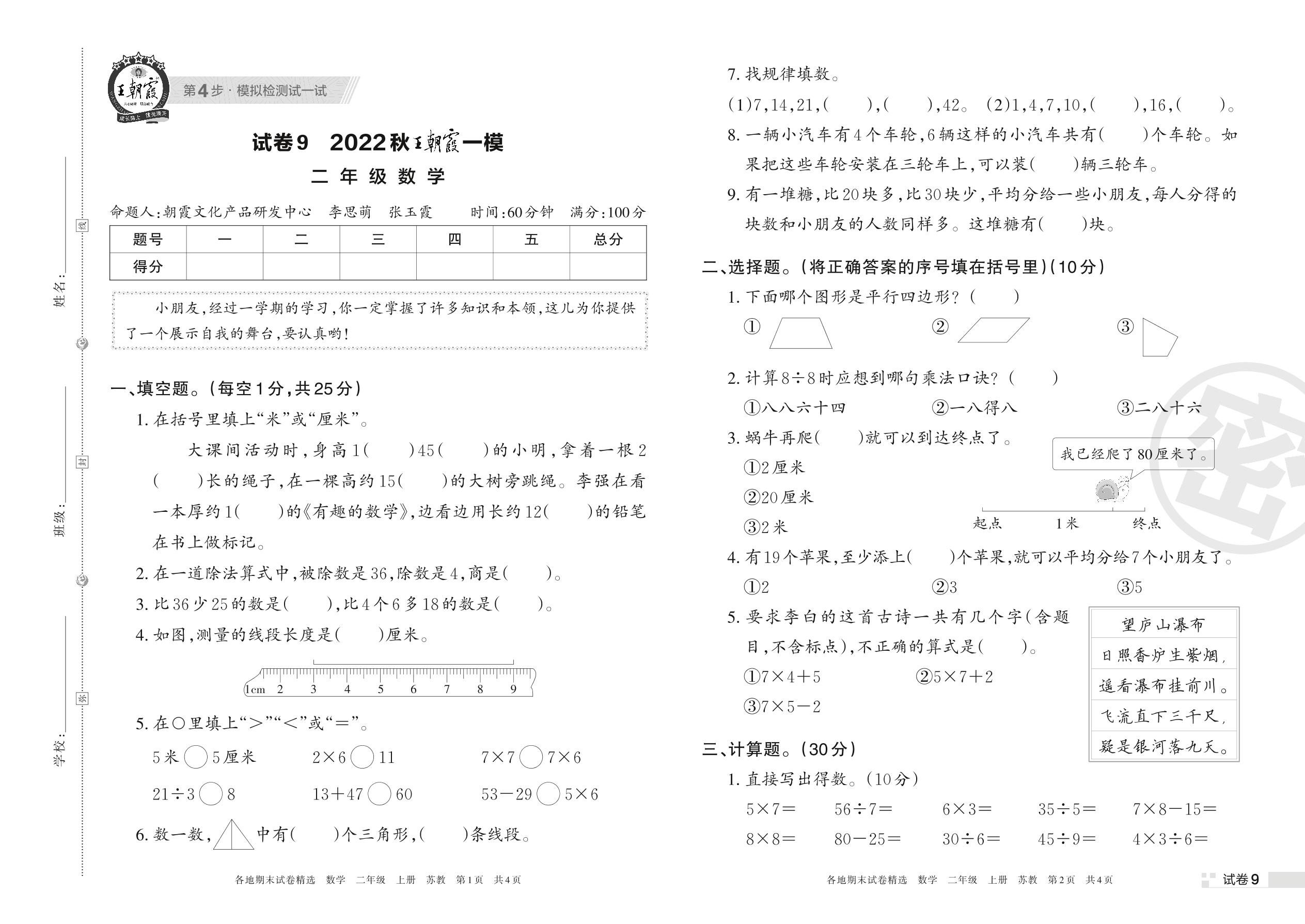 王朝霞期末模拟卷二年级上册数学(苏教版)_R221122161842121【9】