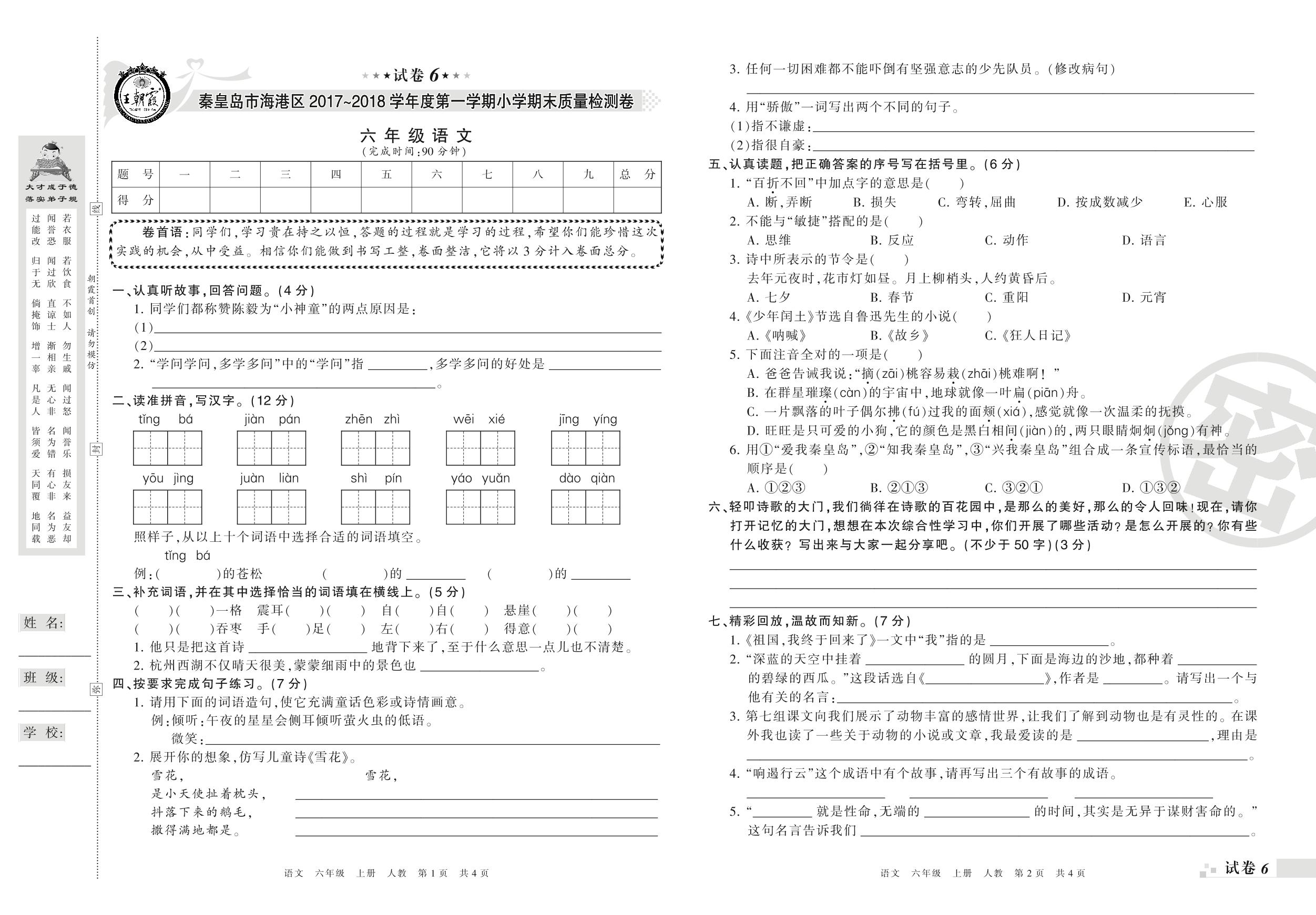 2017-2018学年第一学期秦皇岛市海港区六年级语文试卷(人教版)【6】