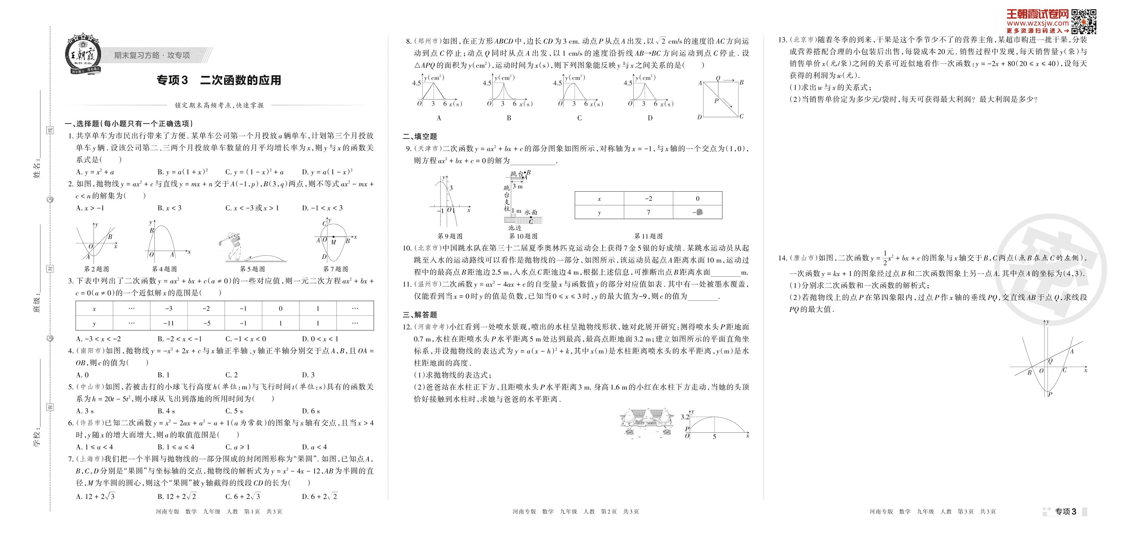 王朝霞期末专项卷——二次函数的应用九年级上册数学(人教版)【3】