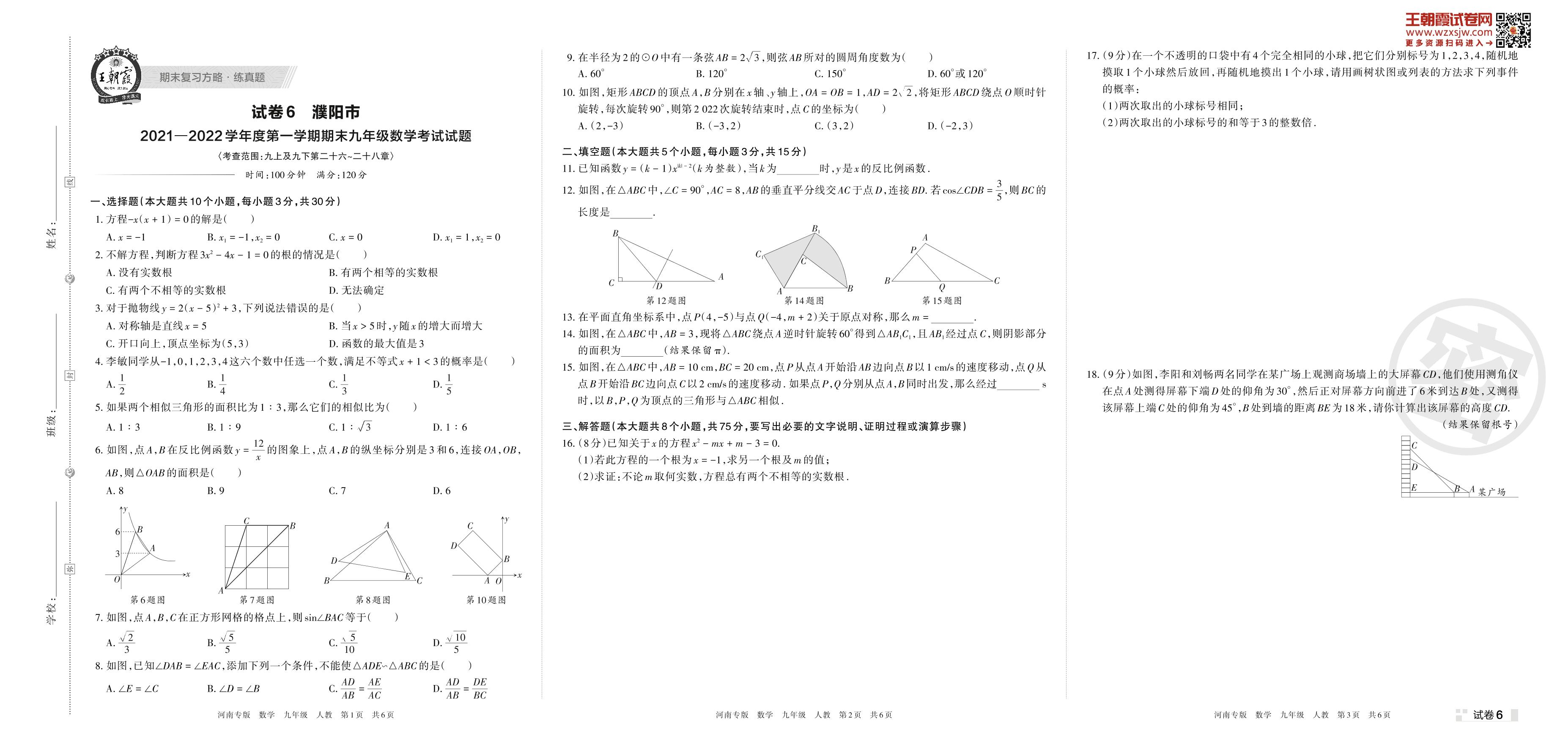 濮阳市2021—2022学年度第一学期期末九年级数学考试试题(人教版)【6】