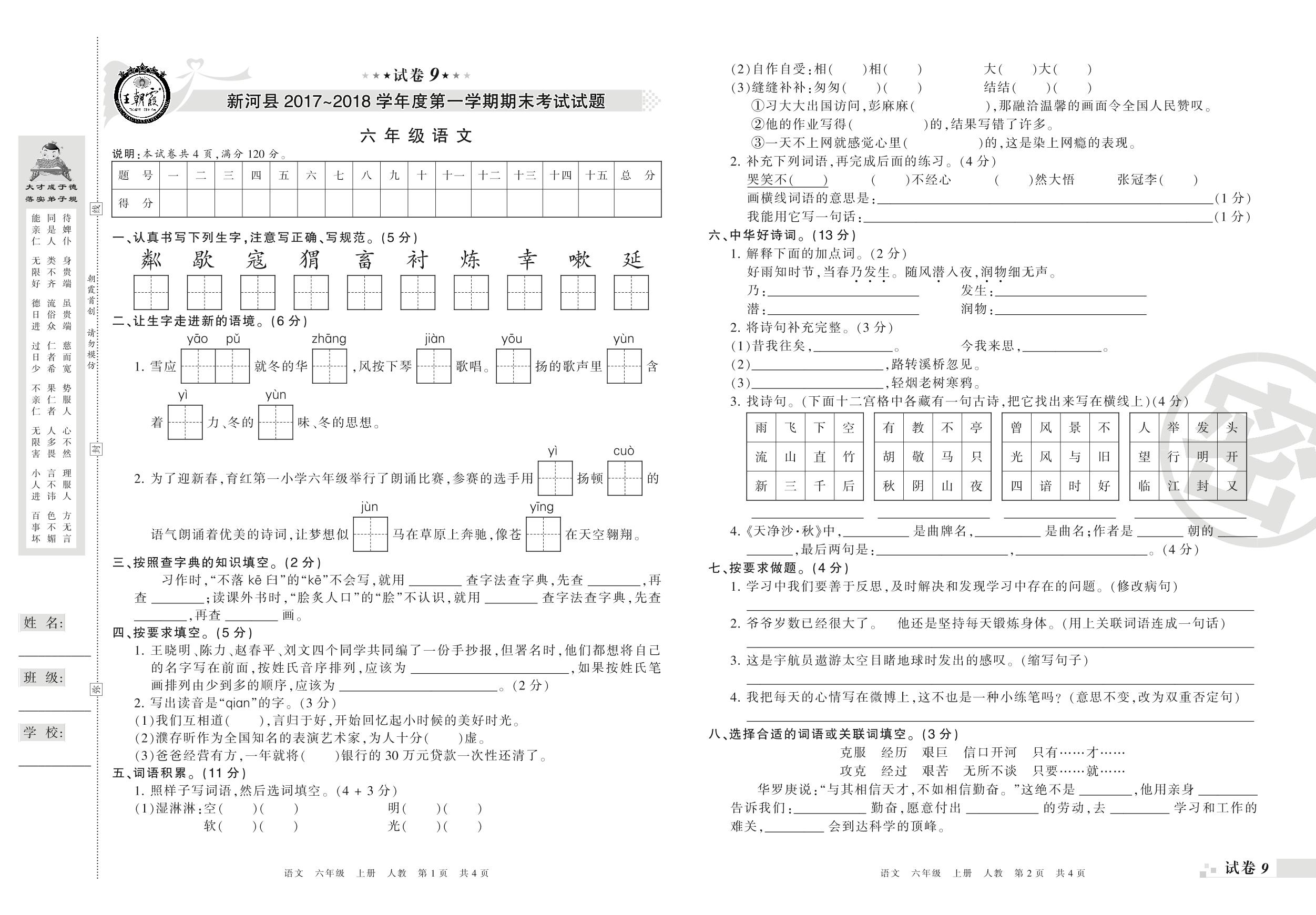 2017-2018学年第一学期邢台市新河县六年级语文试卷(人教版)【9】